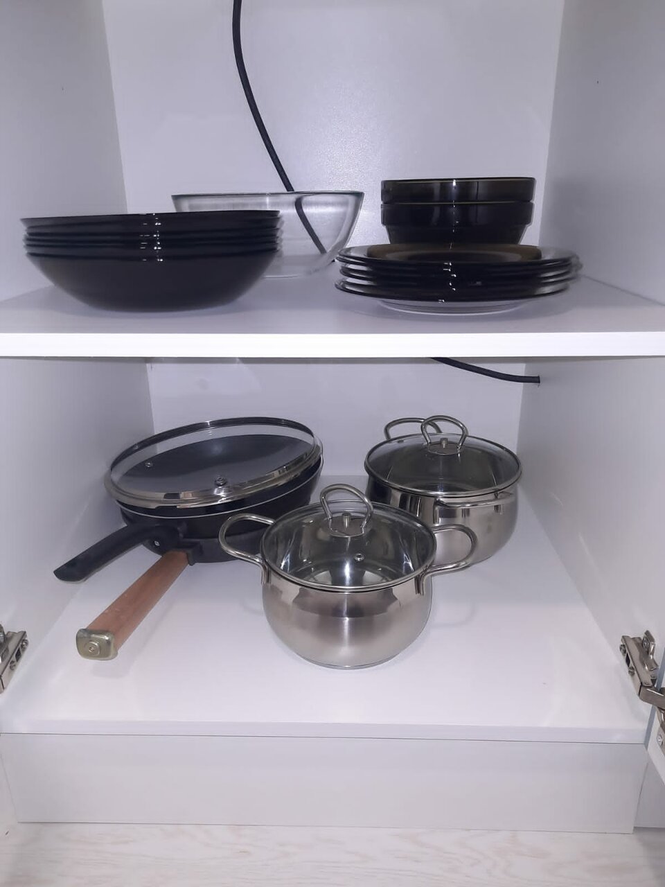 - Полная кухонная утварь и техника (чайник, микроволновка, холодильник, плита).
