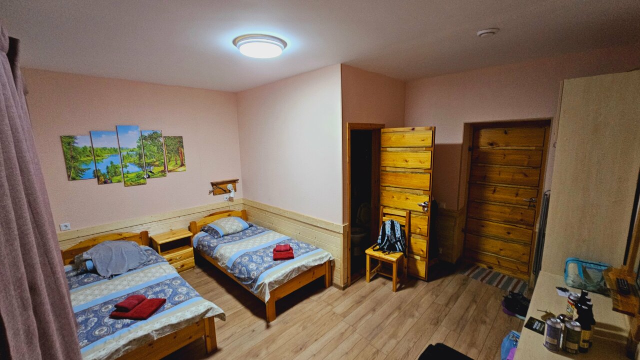 Отличный номер, балкон, вид в лес. Мангал, на кухне всё необходимое. Можно купаться, кататься на квадриках ( все рядом в пракат)