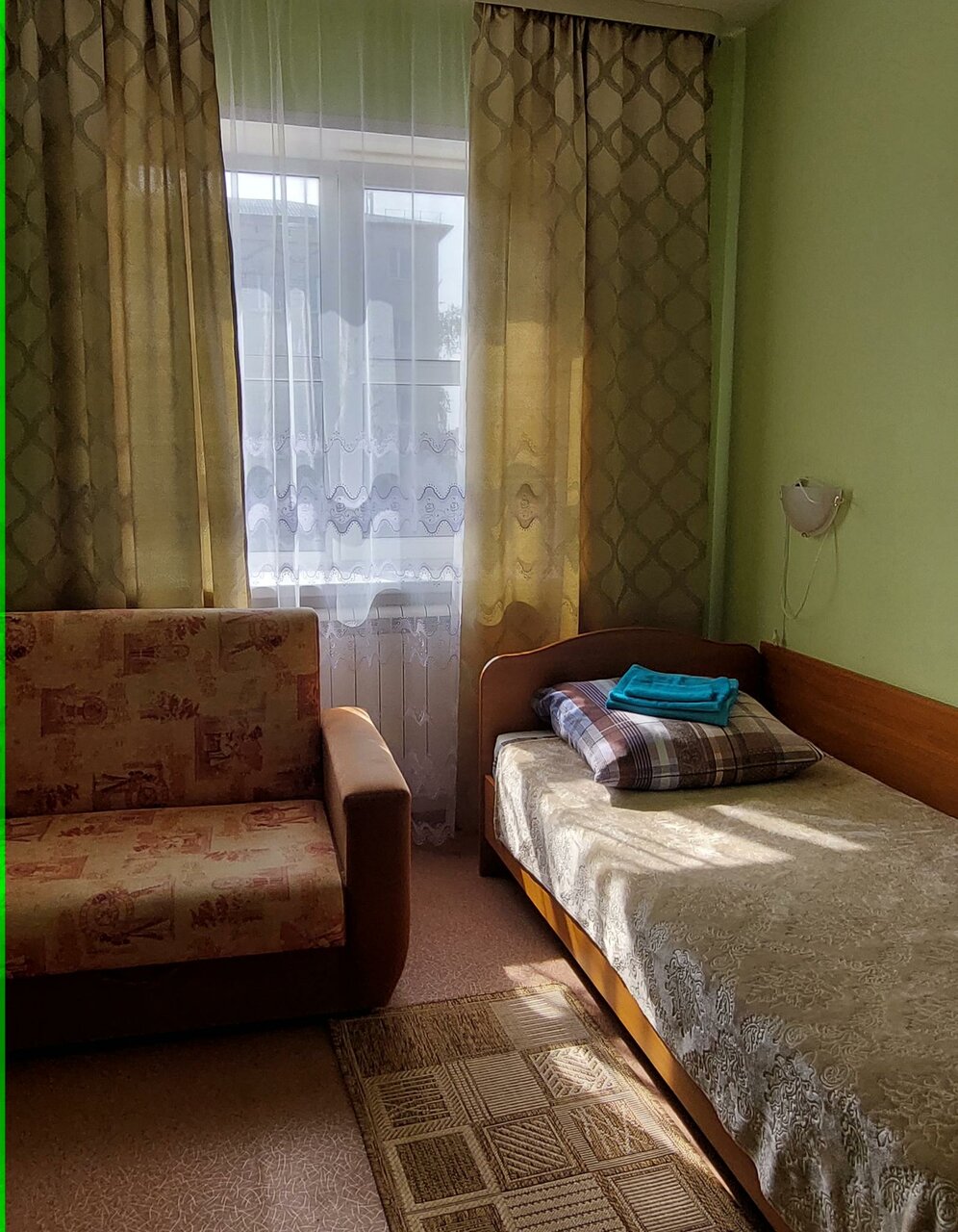 Останавливались с внуком на сутки в двухместном номере. В номере 2 односпальные кровати,стол,холодильник,телевизор,стулья,тумбочки,шифоньер, чашки,ложки,вилки. Туалет,душ на этаже. Так же есть микроволновка и горячая вода для чая. Нормальные условия чтобы переночевать.