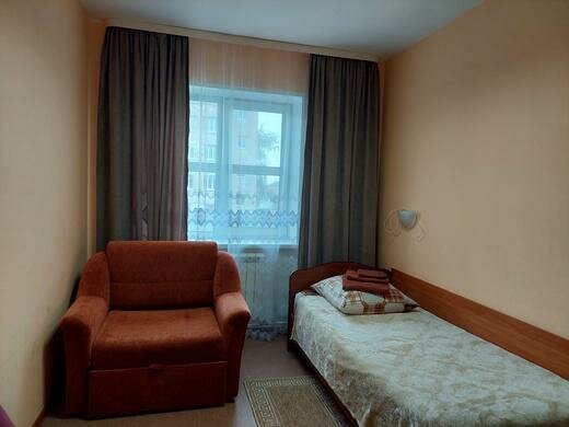 Обычная гостиница ничего сверх естественного нет. Я снял одноместный номер мебель, спальное место кровать старенькое, но в остальном нормально чайник есть холодильник, телевизор есть чисто
