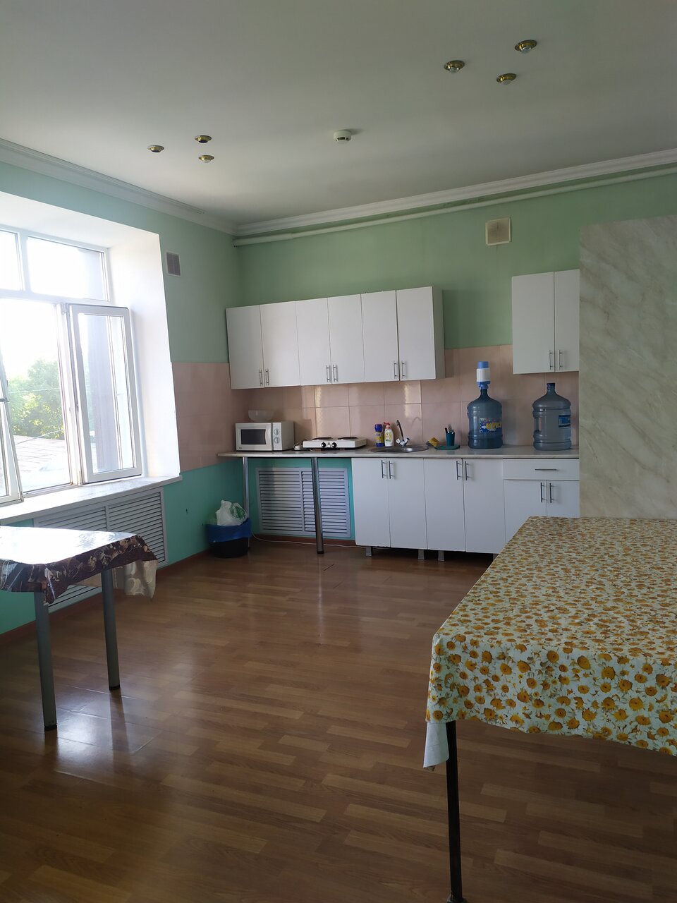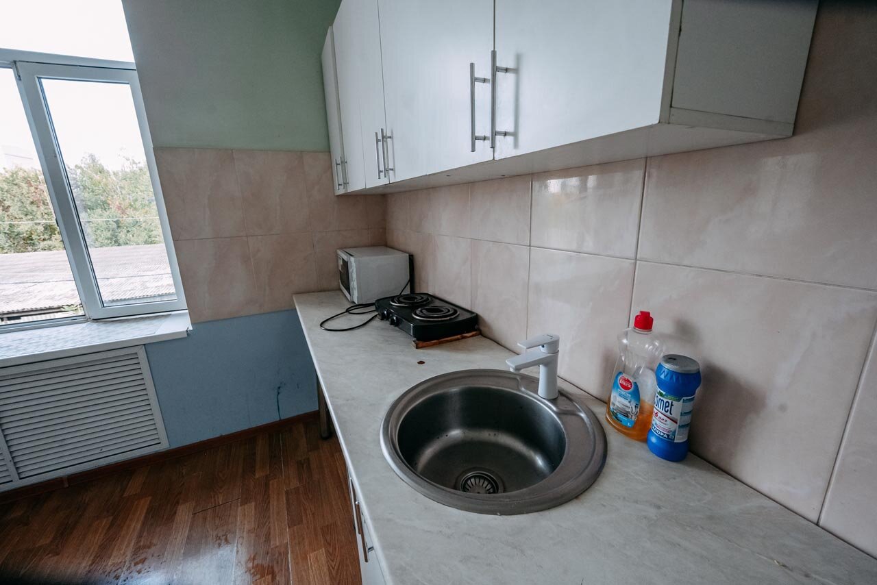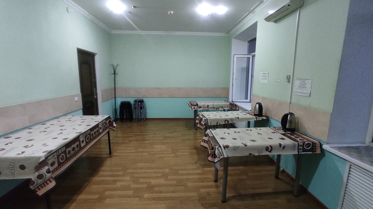 - Общая кухня с плитой, микроволновкой, посудой и чайниками.