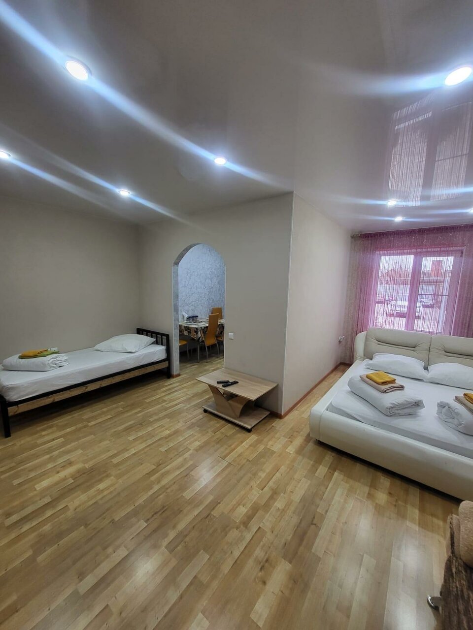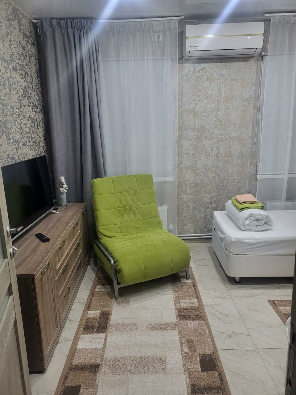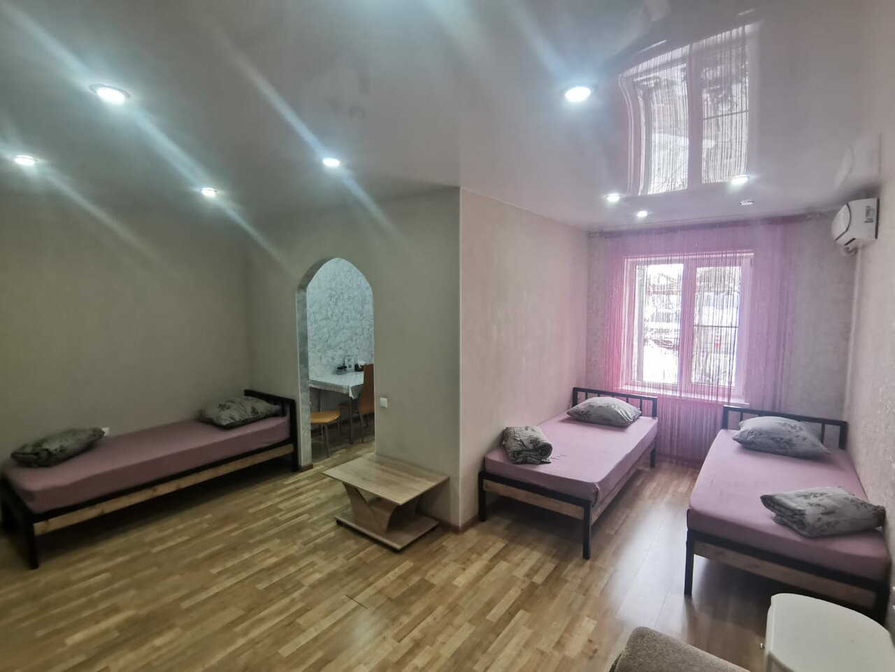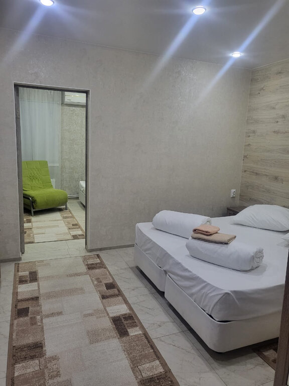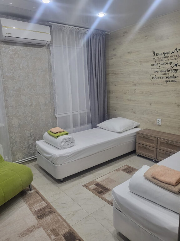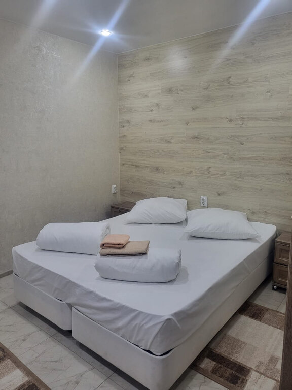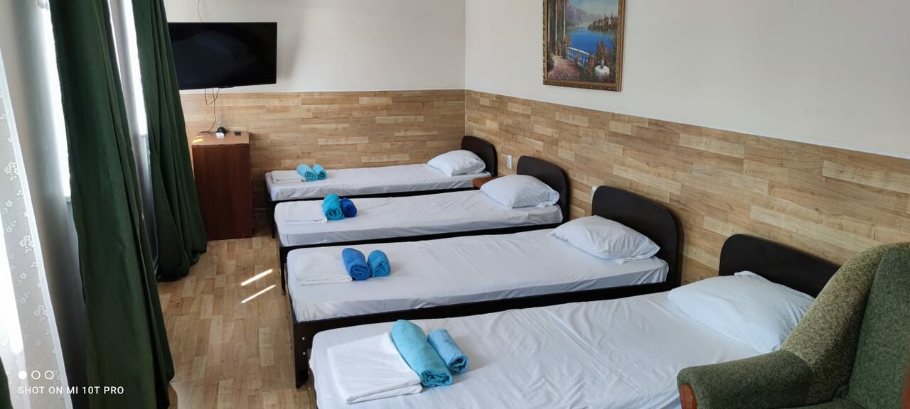 Услуги: — Номера (3000–6500 ₽/ночь) с кондиционером, Wi-Fi, ТВ, санузлом, кухонной зоной (плита, посуда, холодильник). — Бесплатная парковка, общая прачечная, проживание с животными (платно). — Для гостей: фен, халаты, ускоренная регистрация, доставка еды и цветов в номер.