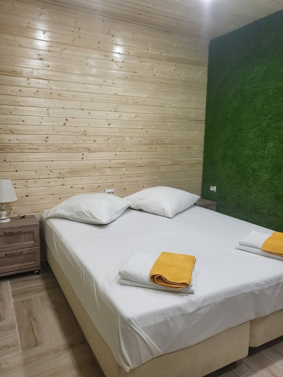 Очень чистые домик, белье, полотенцат также чистое. Хорошие кровати. Переночевать нормально. Есть плита газовая, микроволновка.
