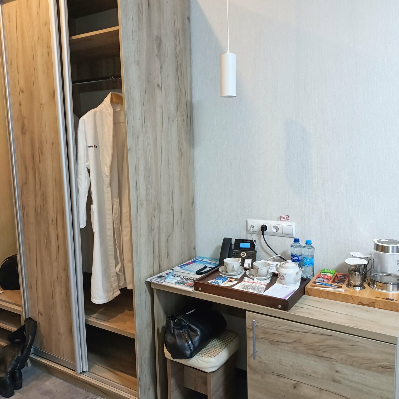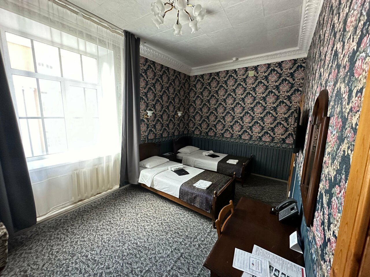 Гостиница ещё в процессе ремонта и улучшения. Есть пицерия на втором этаже и работает до 23:00. Приятный персонал. Есть разные номера. Мы жили в центральном люксе. Внутри как старая сталинская квартира. Потолок требует ремонт. В остальном — уютно. Цена соотвтствует качеству. На ресепшен есть быстая лапша и немного еды на продажу если приехали ночью и хотите перекусить.