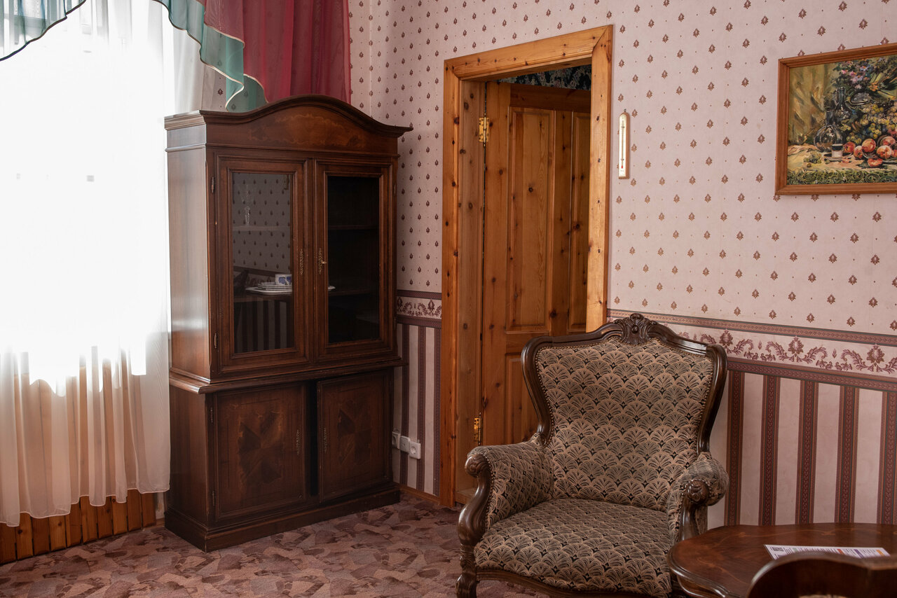 Шикарный вид из номера с эркером на горы. Советский ремонт, фасад разрушается, каждый раз когда входишь надо звонить в звонок, немного утомляет, комнаты просторные, холодильник древний, вода из-под крана воняет болотом, но на первом этаже кулер. Лучшая гостиница этого города.