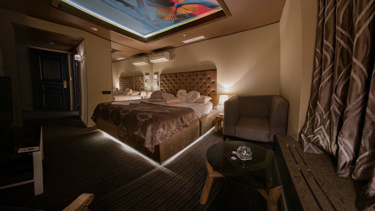 Стильный и очень просторный трехкомнатный номер с двумя спальнями и гостиной. В спальнях - широкие двуспальные кровати, шторы black-out. В гостиной - мягкая мебель, большой TV, проектор и караоке с акустической системой.