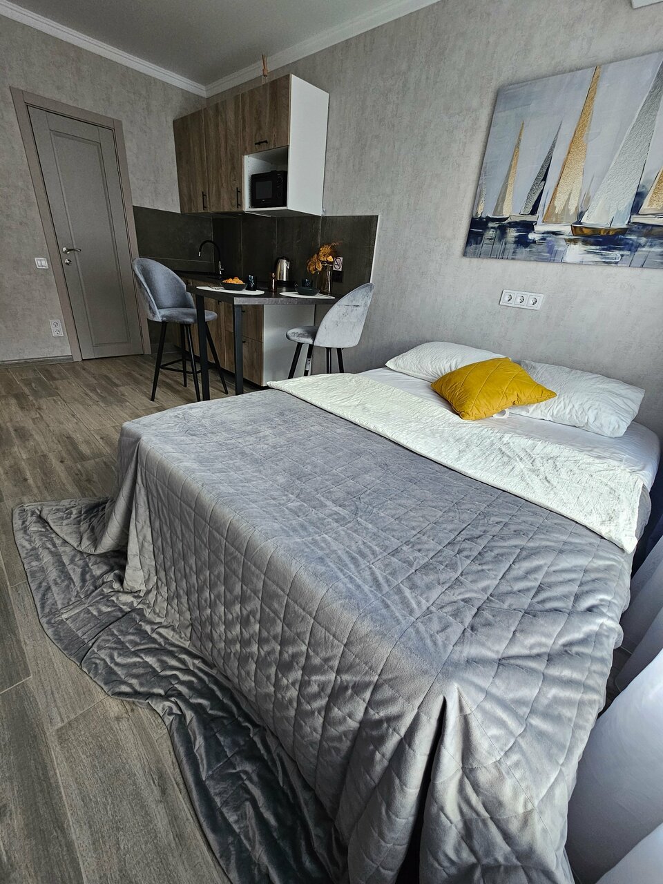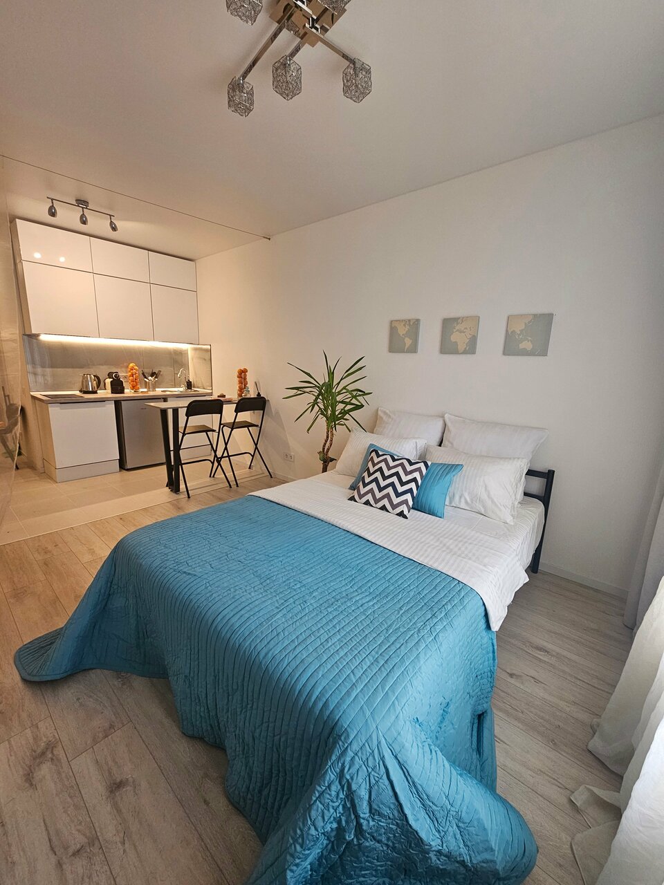 Чистая, уютная, светлая студия. В реальности там лучше чем на фото. Все необходимое есть, магазины все рядом. Тихий двор с детской площадкой. Нам очень понравилось!
