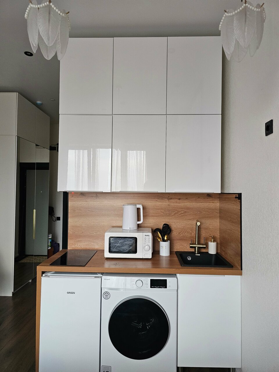 Уютная,стильная студия. Без проблем заселились бесконтактно. Администратор по ватсап помогла с заселением, не смотря на поздний час. Всё очень понравилось. Чисто, светло, всё необходимое в наличии: полотенца на двоих, разовые зубные щетки в индивидуальной упаковке и прочие бытовые мелочи. Депозит вернули по итогам проверки комнаты.