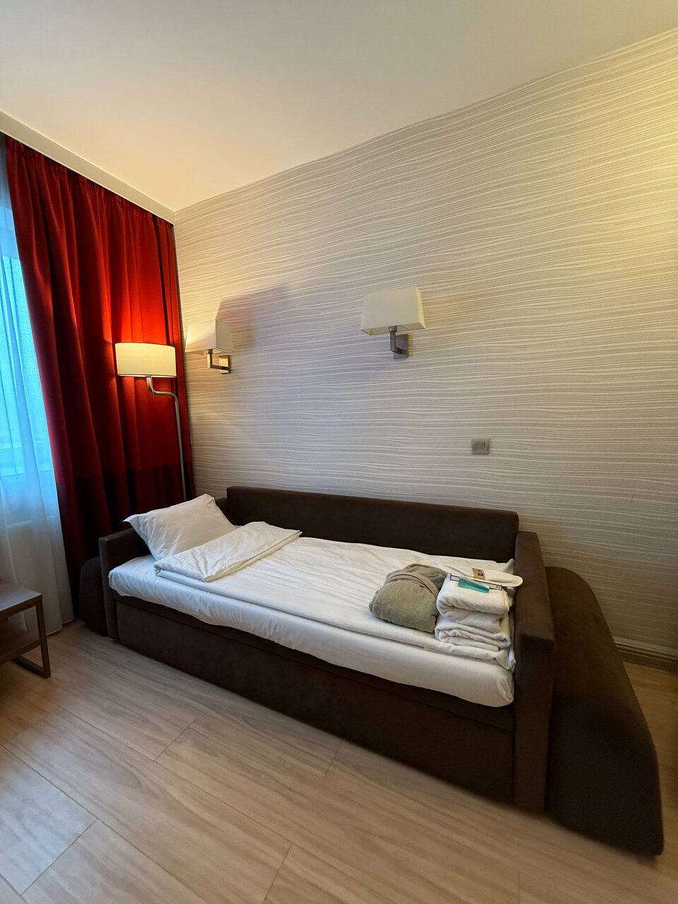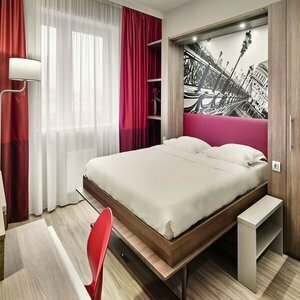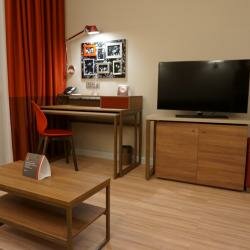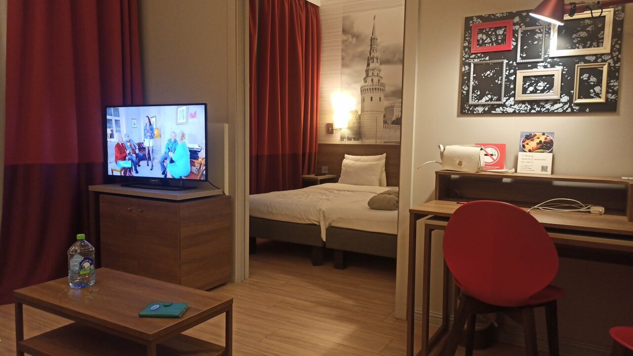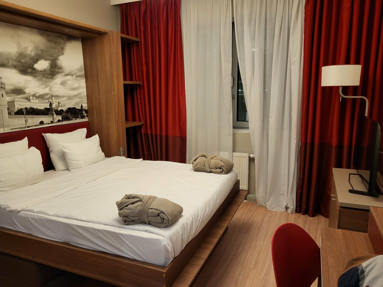 В одном здании три отеля, но нам с первого раза приглянулся Adagio. Система бронирования через сетевые сервисы позволяет снизить цену в три-четыре раза. Довольно чисто, уборка ежедневно, маленькая кухня, холодильник. То есть все, что нужно для пребывания нескольких дней в Москве.