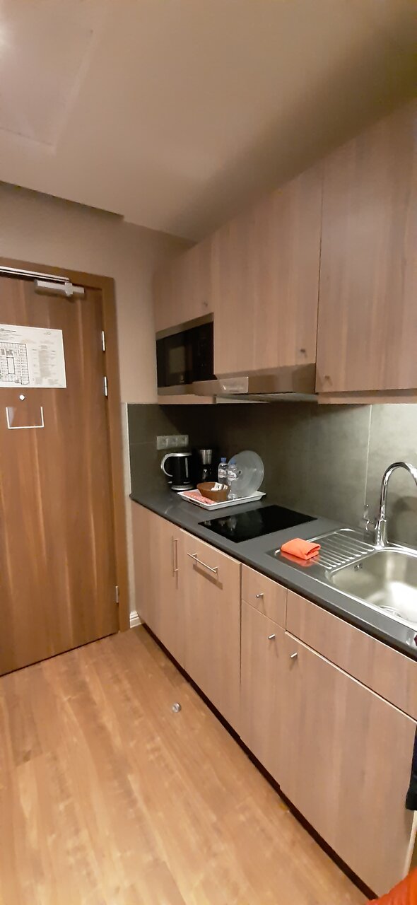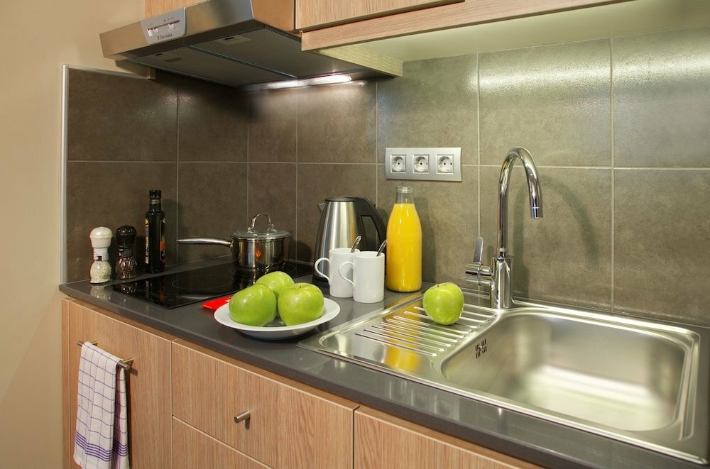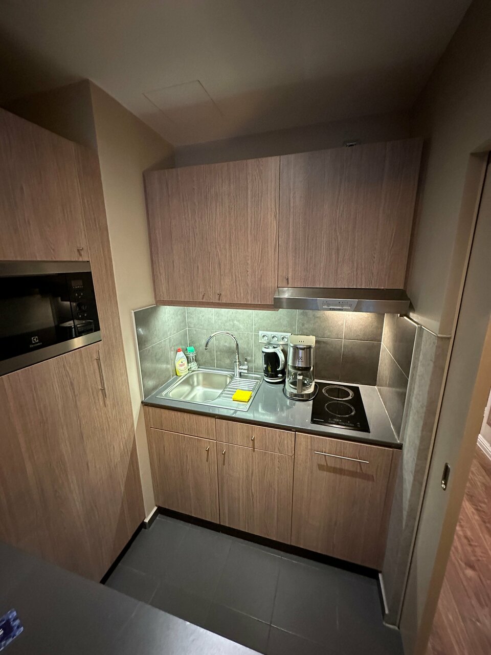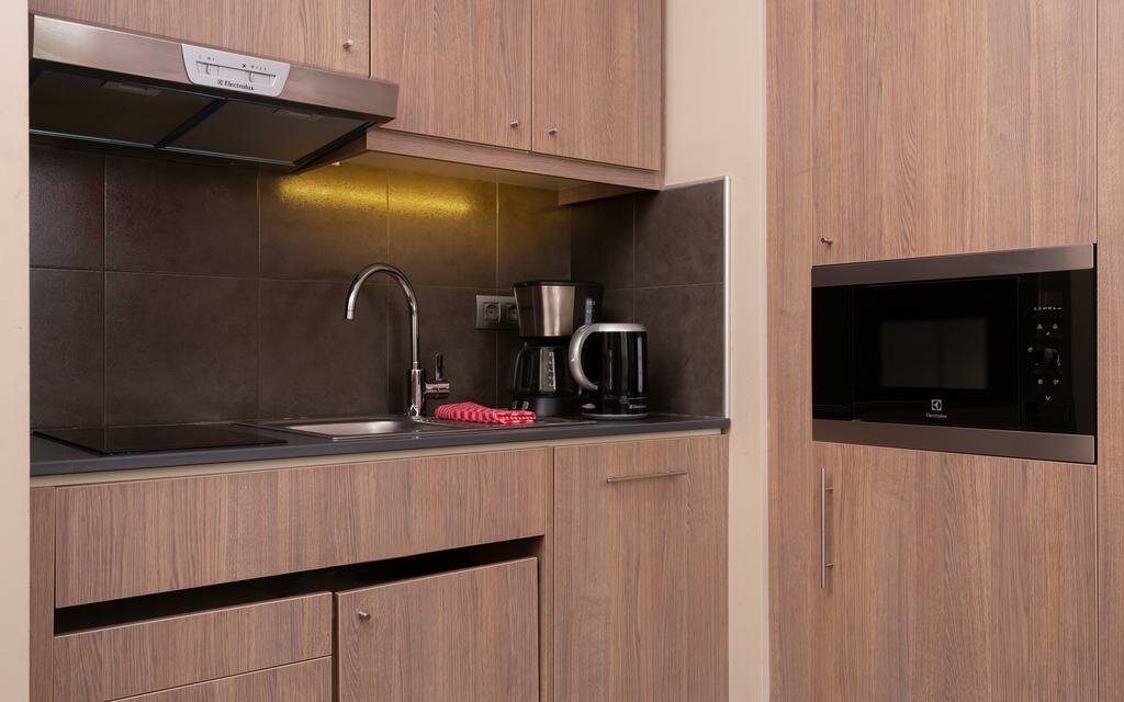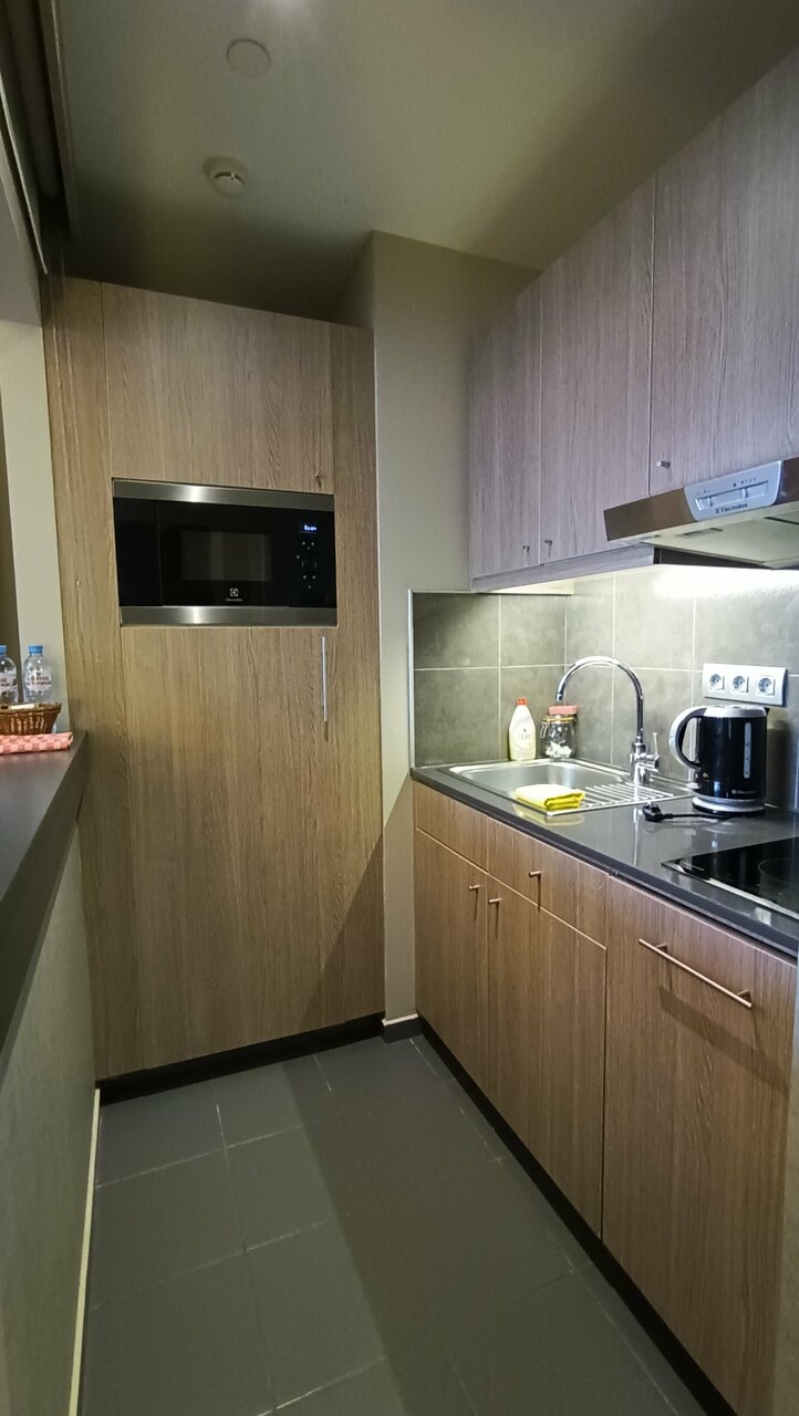 Жили в апартаментах, очень продуманный номер. Кухня имеет всё необходимое для приготовления еды. Есть посудомойка, гладильная доска и утюг, кофеварка.