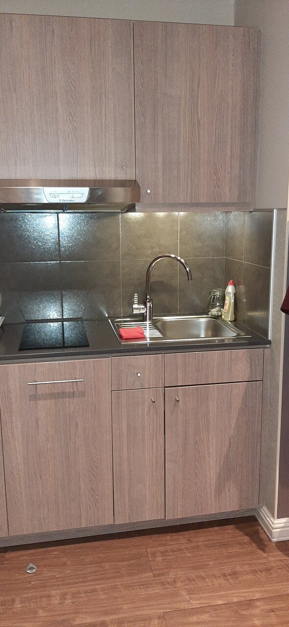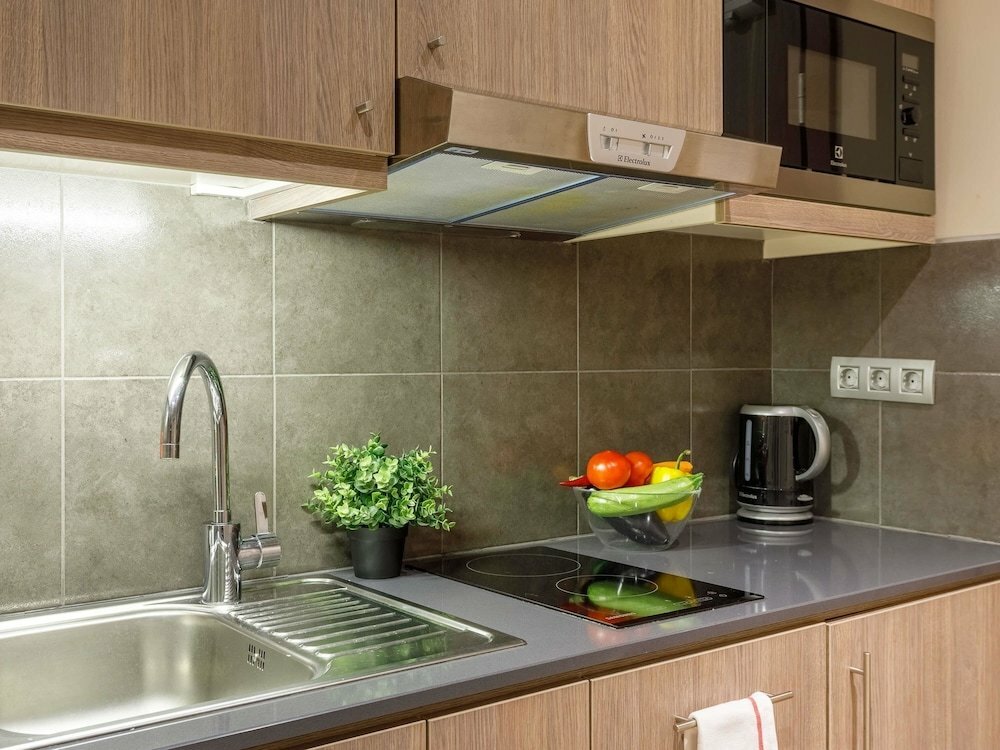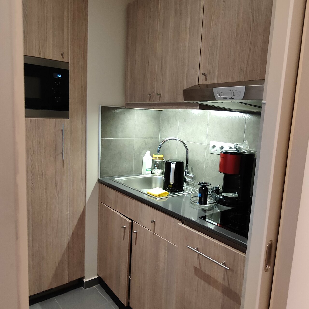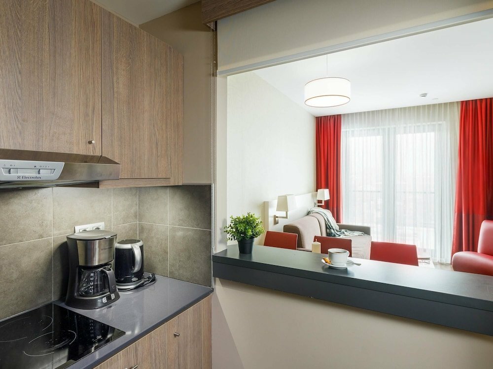Жили в апартаментах, очень продуманный номер. Кухня имеет всё необходимое для приготовления еды. Есть посудомойка, гладильная доска и утюг, кофеварка.