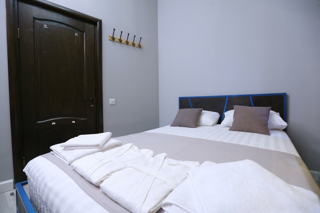 Общие душевые комнаты, но чистые, так как мало номеров. Номер с балконом и видом на Арбат не шумный. Персонал отзывчивый. Кофемашина. Рекомендую