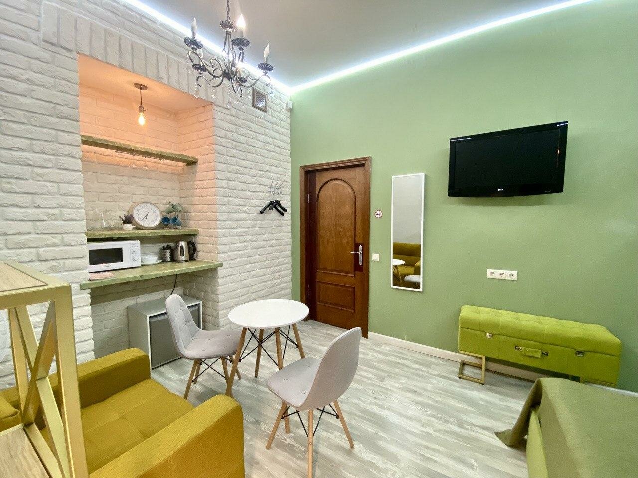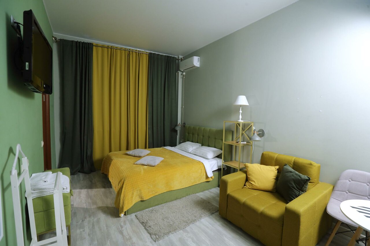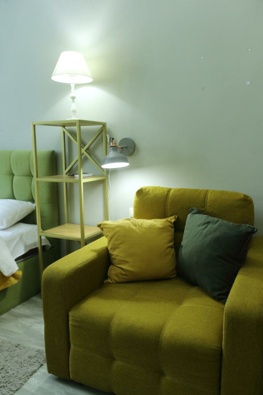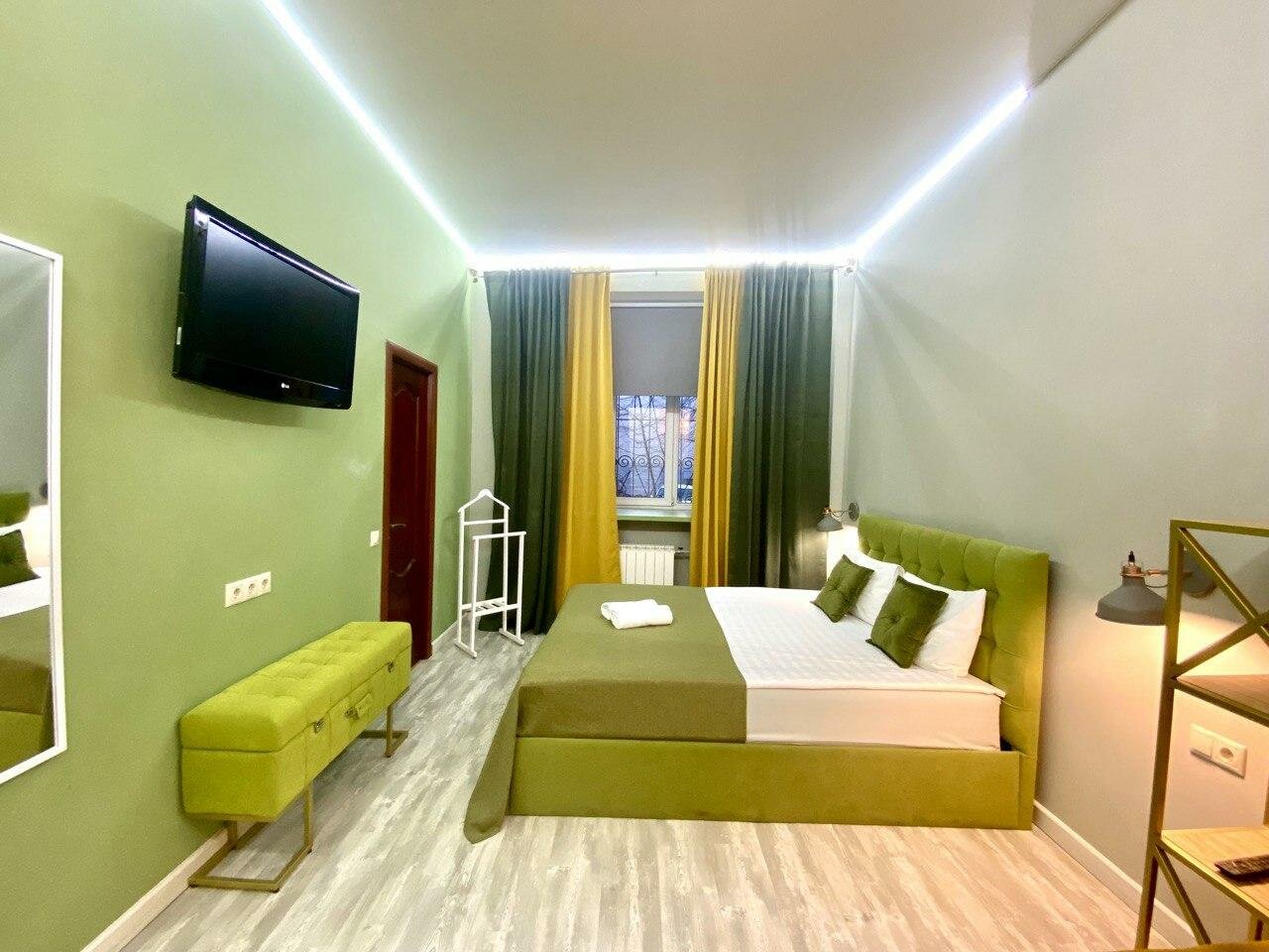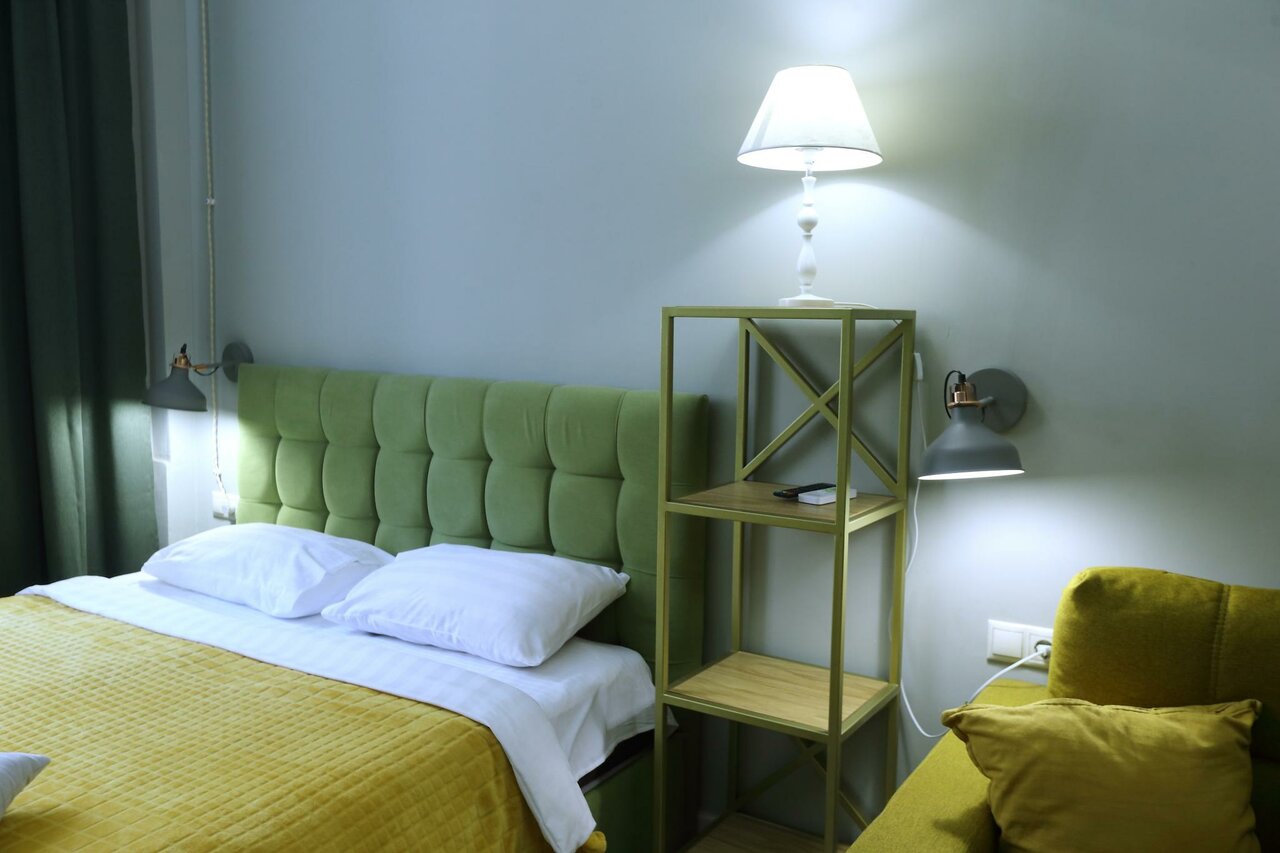 Номер оформлен в современном стиле с акцентом на теплые зеленые и желтые тона. Уютная кровать с мягким изголовьем и удобным матрасом гарантирует комфортный отдых. Светильники у кровати создают мягкое освещение.