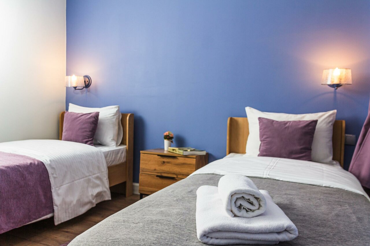 Стильный номер с двумя односпальными кроватями выполнен в спокойных тонах, обеспечивая атмосферу уюта и отдыха. Вместительный санузел с душевой кабиной гарантирует комфорт и качество.