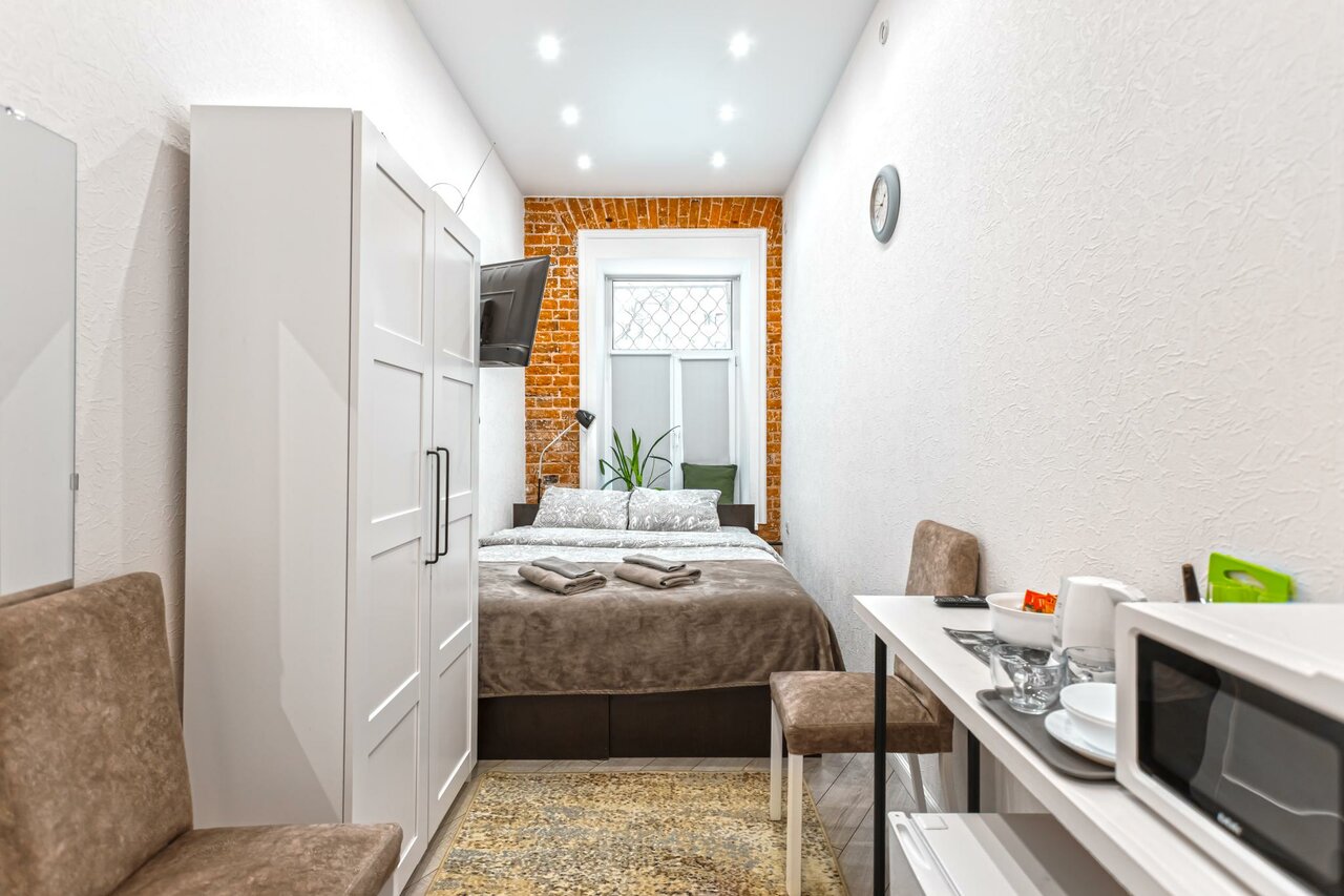 Проживание в номере стандарт, в номере: двуспальная кровать, ТВ, Шкаф, рабочий стол, окно, душевая, мини-кухня (СВЧ печь, чайник, холодильник, обеденный стол, столовые приборы)