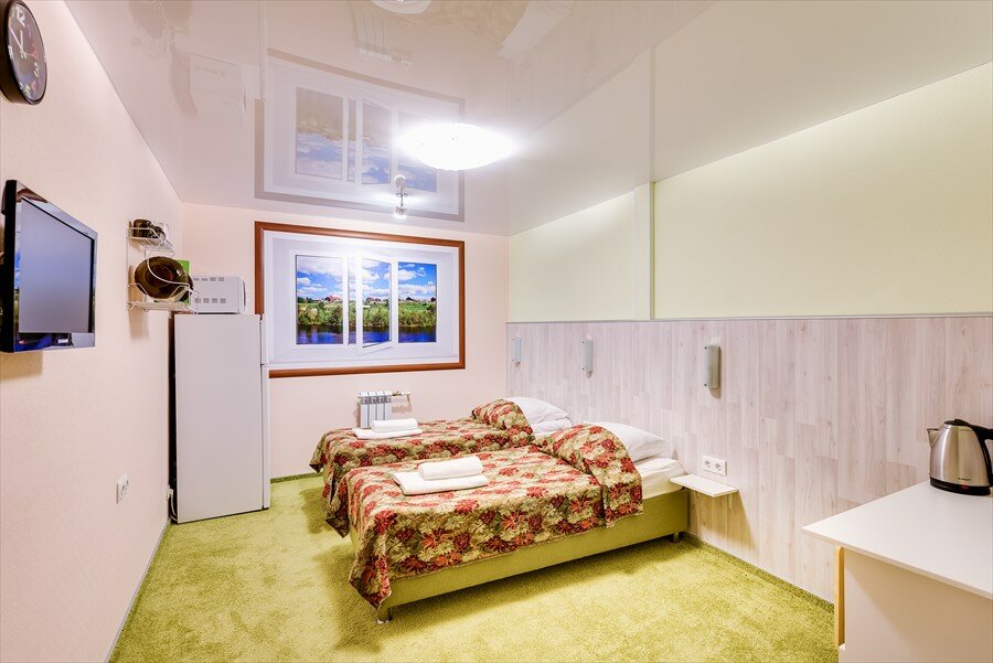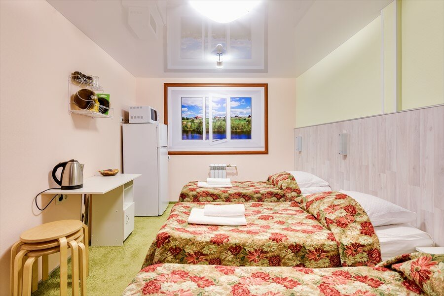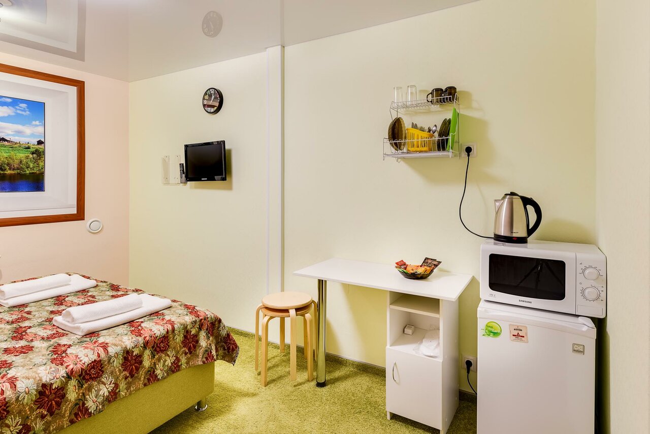 Бюджетная гостиница, в номере есть холодильник, микроволновка, полотенца, мыло. Плохая шумоизоляция, слышно разговоры соседей, и некоторые гости курят в номерах
