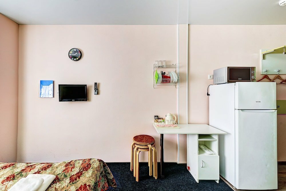 Заехали сегодня, 31 декабря… Планируем провести несколько новогодних дней в Москве. Семья четыре человека. Первое впечатление отлично. Чистый номер, есть холодильник, телевизор, микроволновка, чайник, посуда. Добираться от центра на метро и автобусе. Очень порадовала цена за 4 дня.