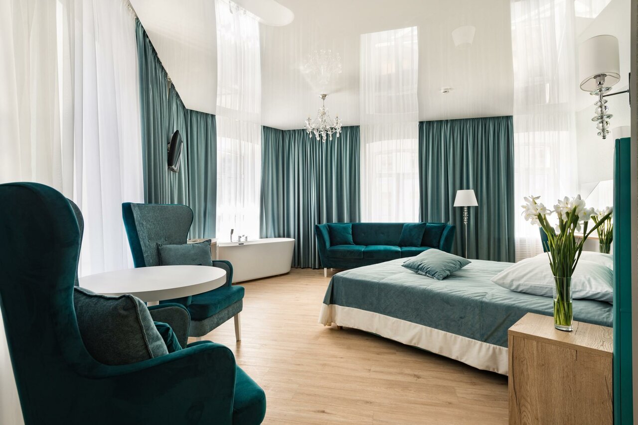 В номере: кровать 180х200 с ортопедическим матрасом, ванна в номере, диван или удобные кресла, гипоаллергенные подушка и одеяло, плоский телевизор, кондиционер, мини-холодильник, фен, большая ванна/душевая, чайный набор, мягкие полотенца, халат, тапо