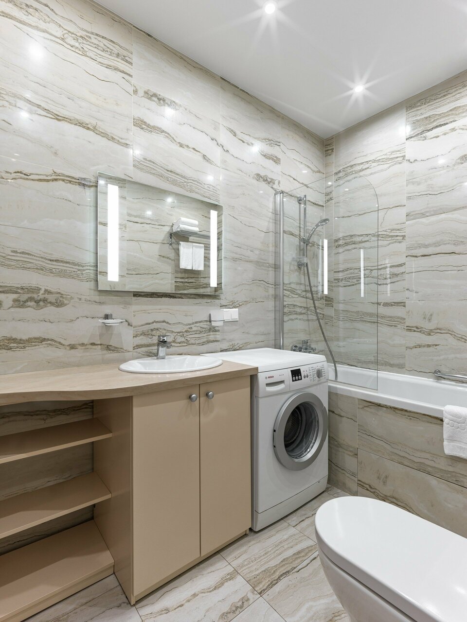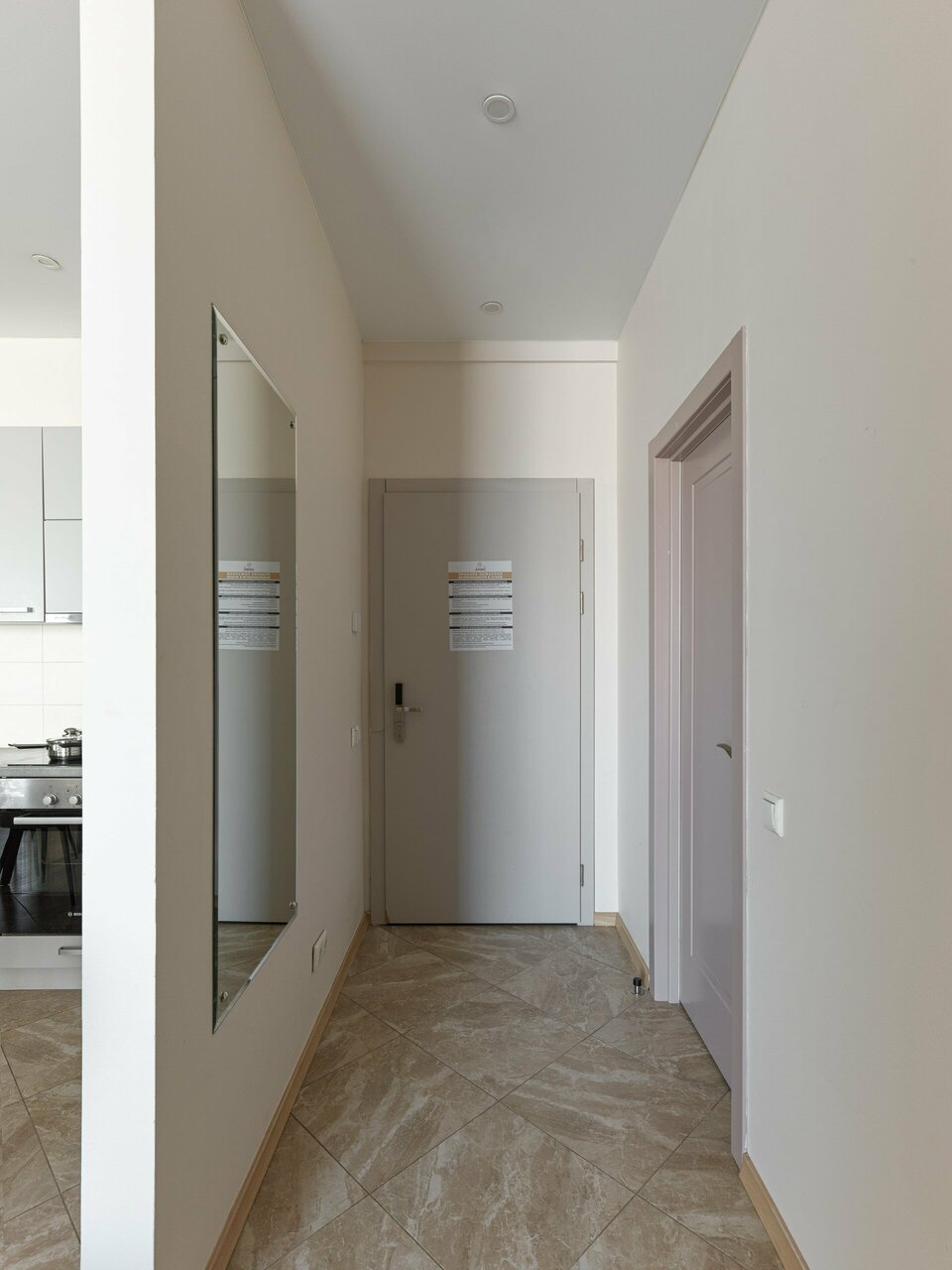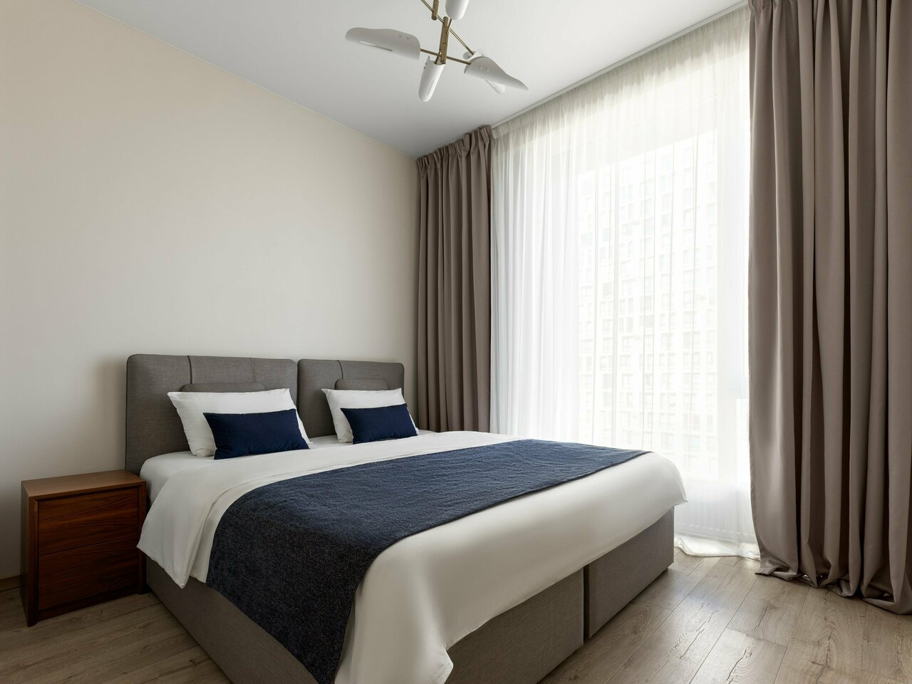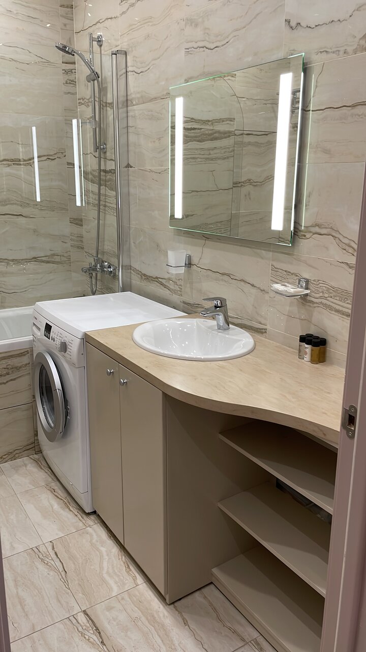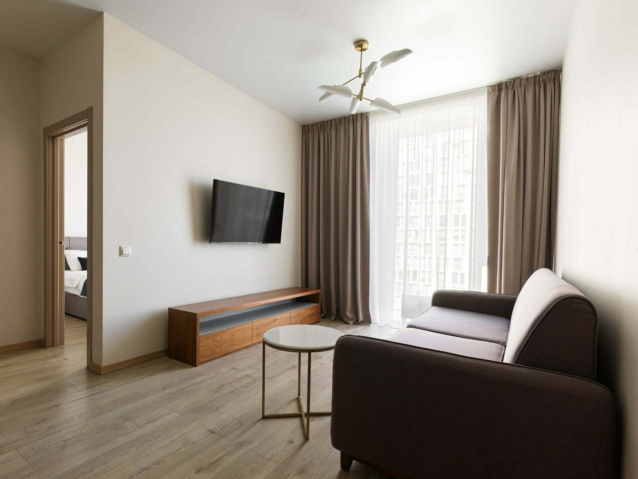 Приехали к 13 час., свободных номеров не было, оплатили, оставили багаж на ресепции и уехали, т.к. поездка рабочая. Приехали вечером, заселили. Номер просторный, есть все необходимое, кухня оборудована всем: посуда, техника. Вода бутилированая, чай, кофе. В ванной есть стиральная машина, наборы для гигиены, халат, тапочки. Персонал отзывчивый. Ресепция девочки молодцы, заселяла Полина. Кафе отеля уютное, питание и обслуживание на твердую пятерку. На огороженной территории много магазинов, пекарен, аптека, кафе, школа, сад и др. Рядом метро, остановка. Минус: 1. Проблемы с подключением ТВ. При заселении оставили заявку, часов в 10 вечера пришел техник, подключили. В день выезда с утра отключился, появилась надпись, что номер в режиме выселен. 2. Дверь в номер видимо, плохо установлена или отрегулирована, трясется и стучит от каждого движения в коридоре. Ночью особенно не приятно.