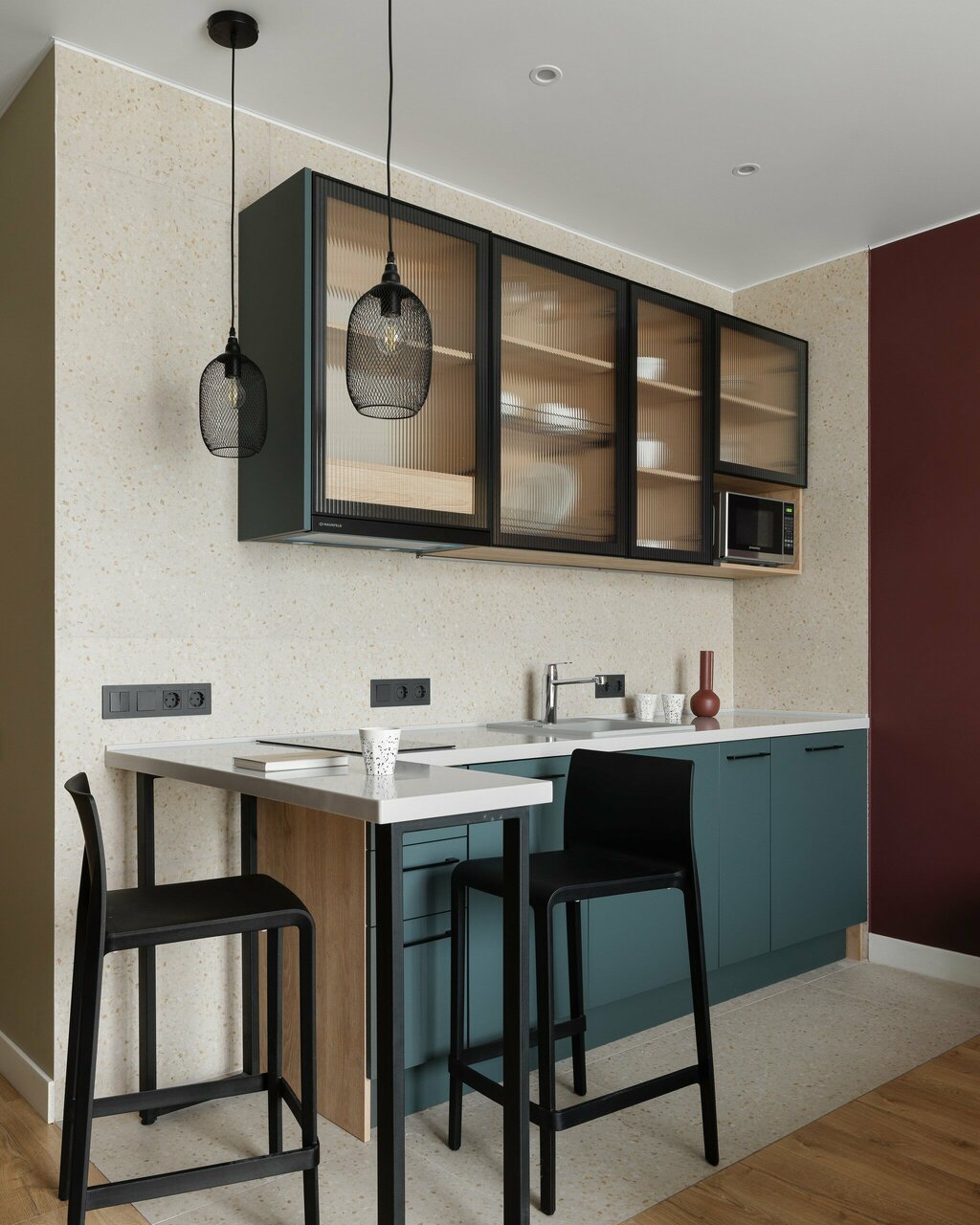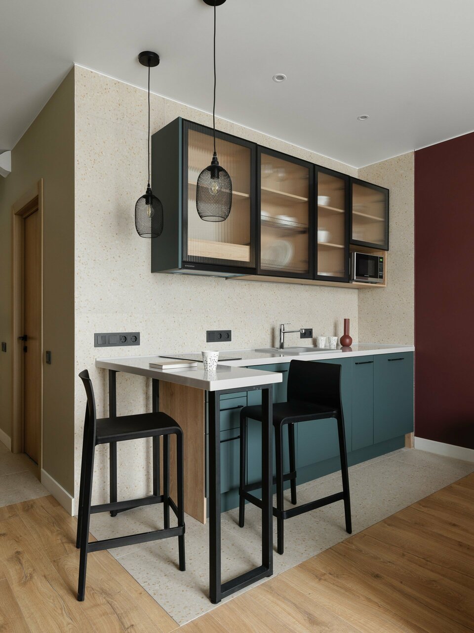 Однокомнатный номер общей площадью 36 квадратных метров с полностью оборудованной кухонной зоной, оснащённой всей необходимой бытовой техникой.