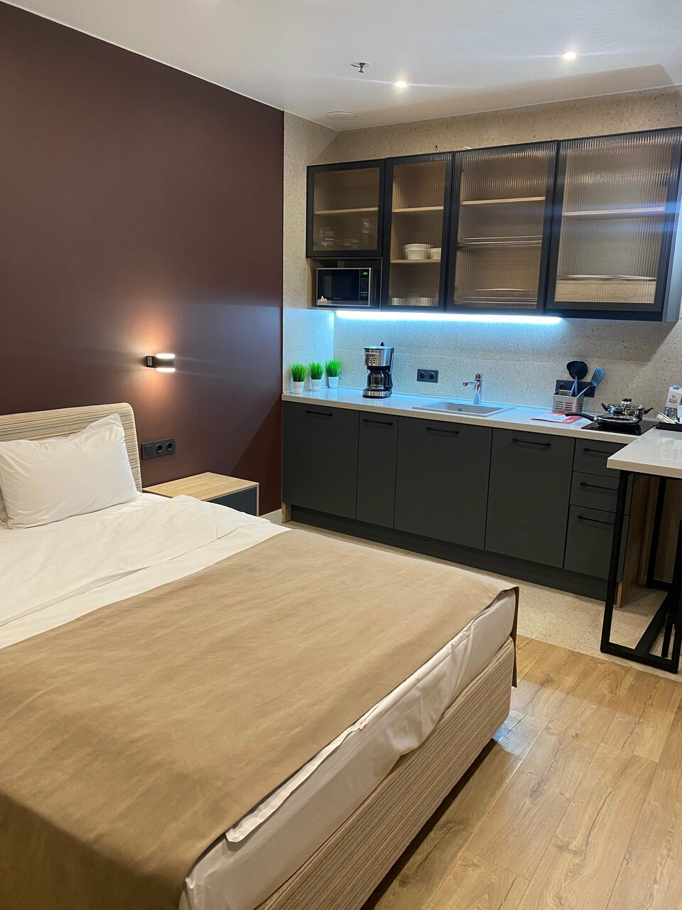Отличные апартаменты, в номере есть кухня в которой все есть для приготовления, есть кофе машина, все очень аккуратно, чисто и стильно, шведский стол на завтра к разнообразный и вкусный.