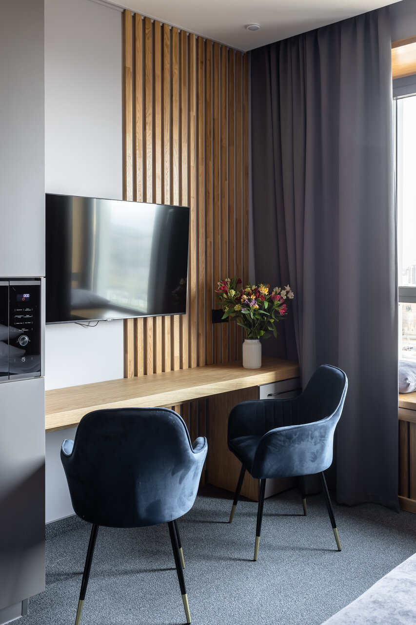 Отвратительные условия проживания. Микроволновка не работает. Номер достаточно грязный и убран плохо, разводы на стенах, пыль. Постоянно громко гудит вытяжка в апарте, которую нельзя выключить. Слабый напор душа, горячая вода начинает литься через несколько минут. В самом номере почти ничего нет, даже полотенца сначала забыли положить. Второй этаж в двухуровневом лофте очень низкий, около 160 см. Неприятный запах во всем ЖК. Плохой интернет в номере. Сам ремонт хороший, но требует обновления. Окно не закрывается до конца. Соседи сверху делают ремонт с 9 утра, в будние дни невозможно находиться на 27 этаже. Ужасный сервис, отвечают грубо, требуют полную предоплату за все время проживания, отказались возвращать деньги, когда мы хотели съехать раньше, а также не решили возникшие проблемы. Думаю, что положительные отзывы куплены, мы были разочарованы, отдых был испорчен, никому не советуем.