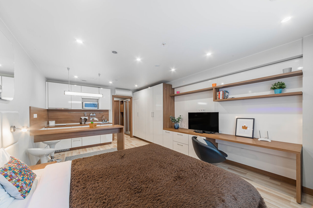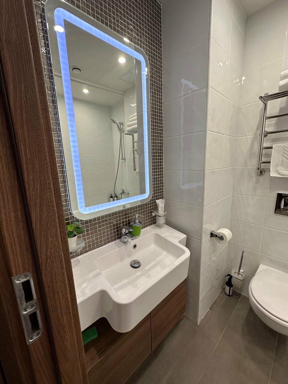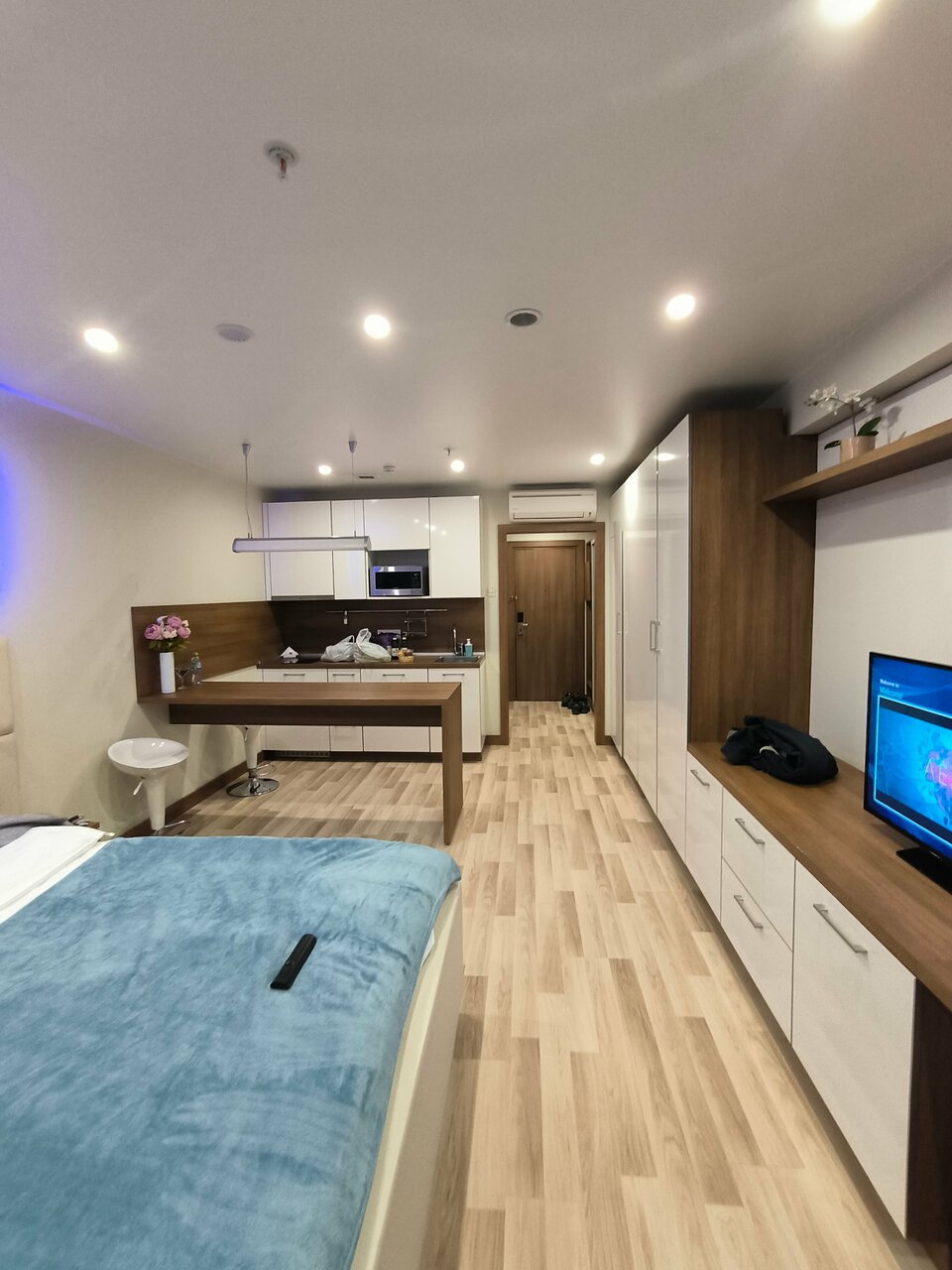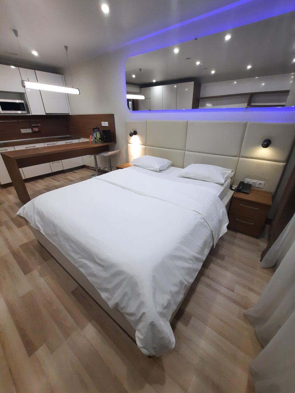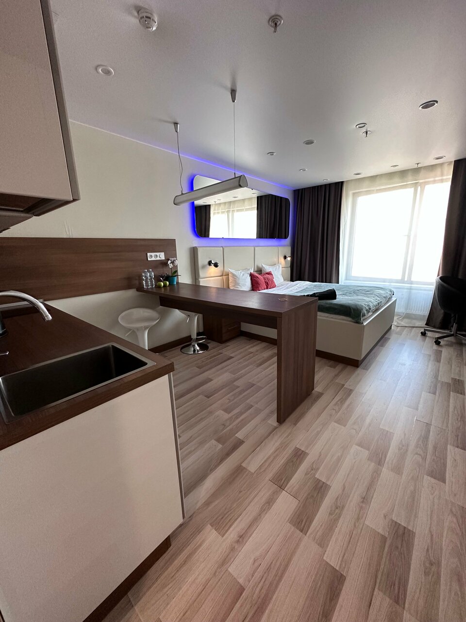 Очень уютное место. Останавливалась впервые, номер на 19 этаже, вид офигенный все необходимые принадлежности есть в ванне и на кухне, удобная кровать, и смарт тв. Внизу есть рестораны и магазины, в 5 минутах езды ТЦ и метро. Рекомендую