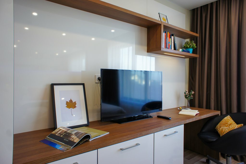 - Хорошая оснащённость (фен, утюг, микроволновка, плита, холодильник, стиральная машина).