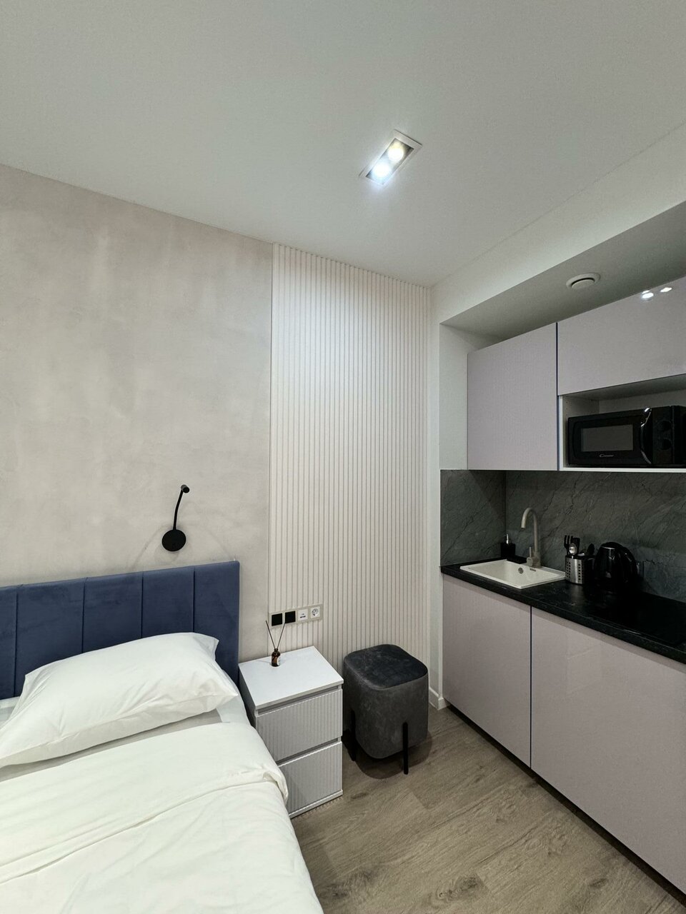 Отличные апартаменты на двоих, полностью оборудованные всем необходимым для длительного проживания, полноценная кухня с плитой, микроволновка, чайник, утюг. Чисто, хорошие полотенца и постельное. В общем рекомендую!
