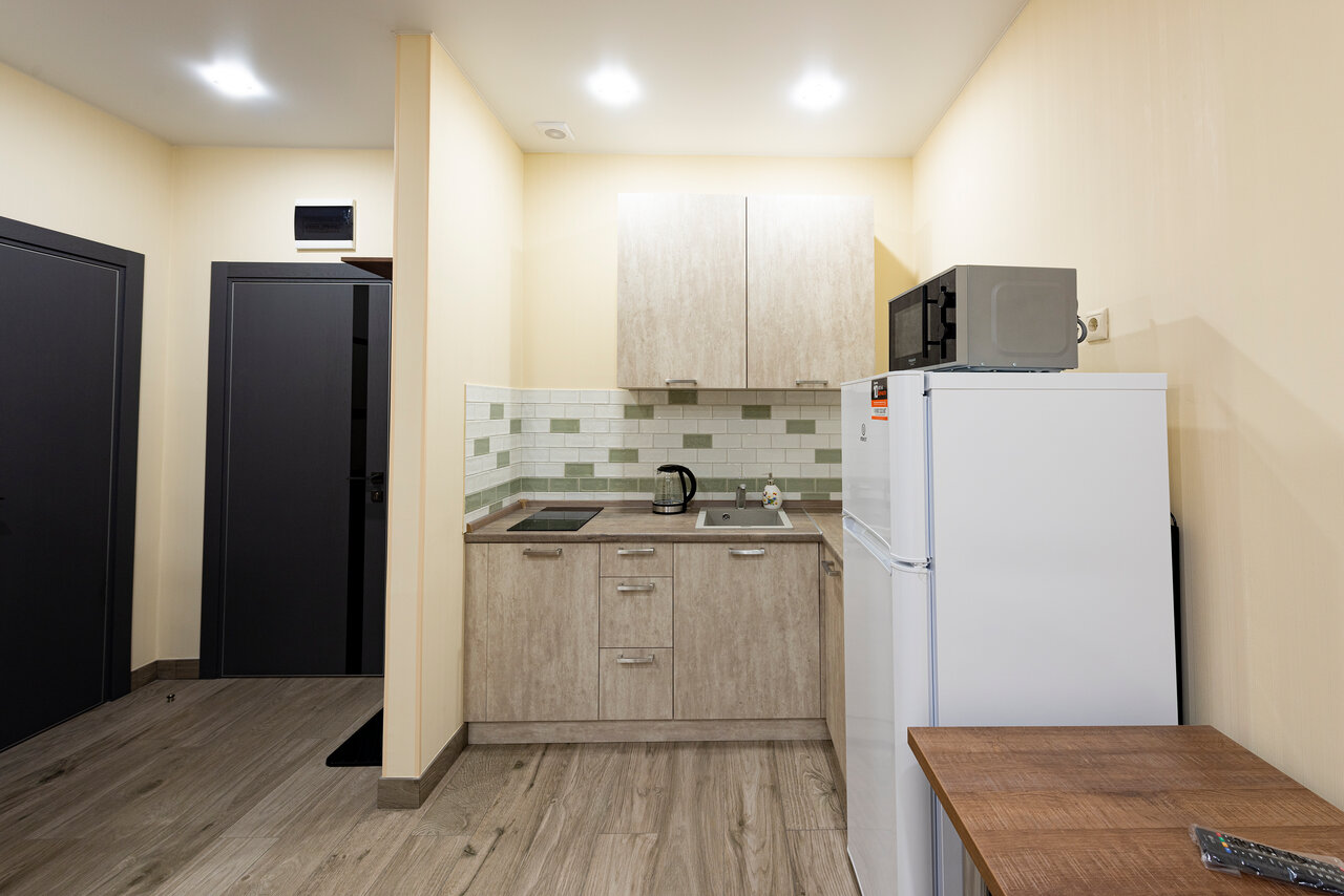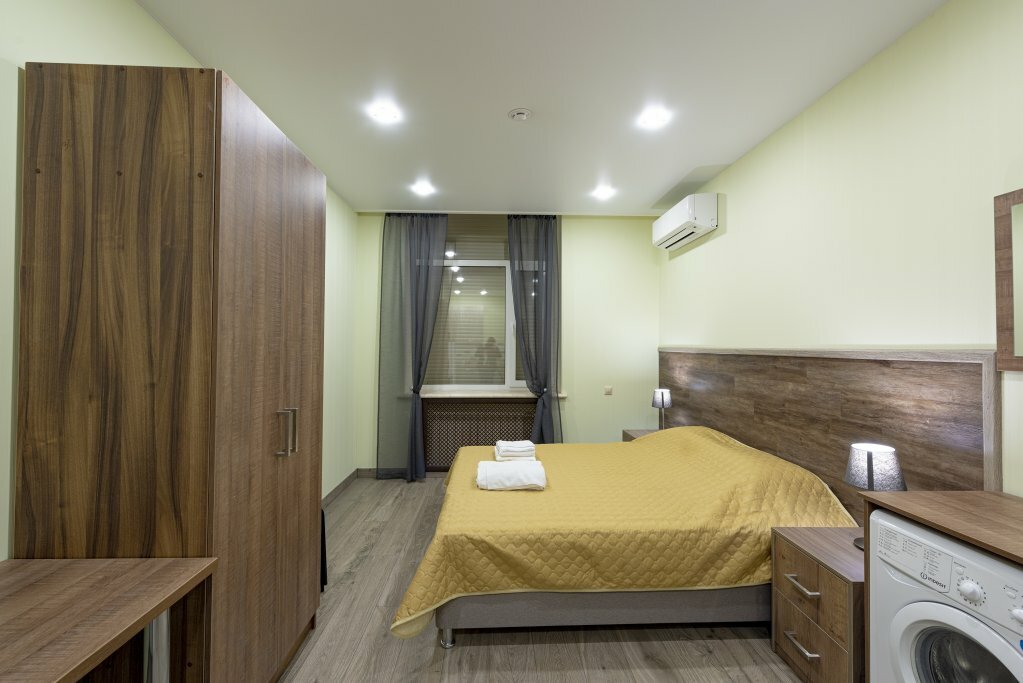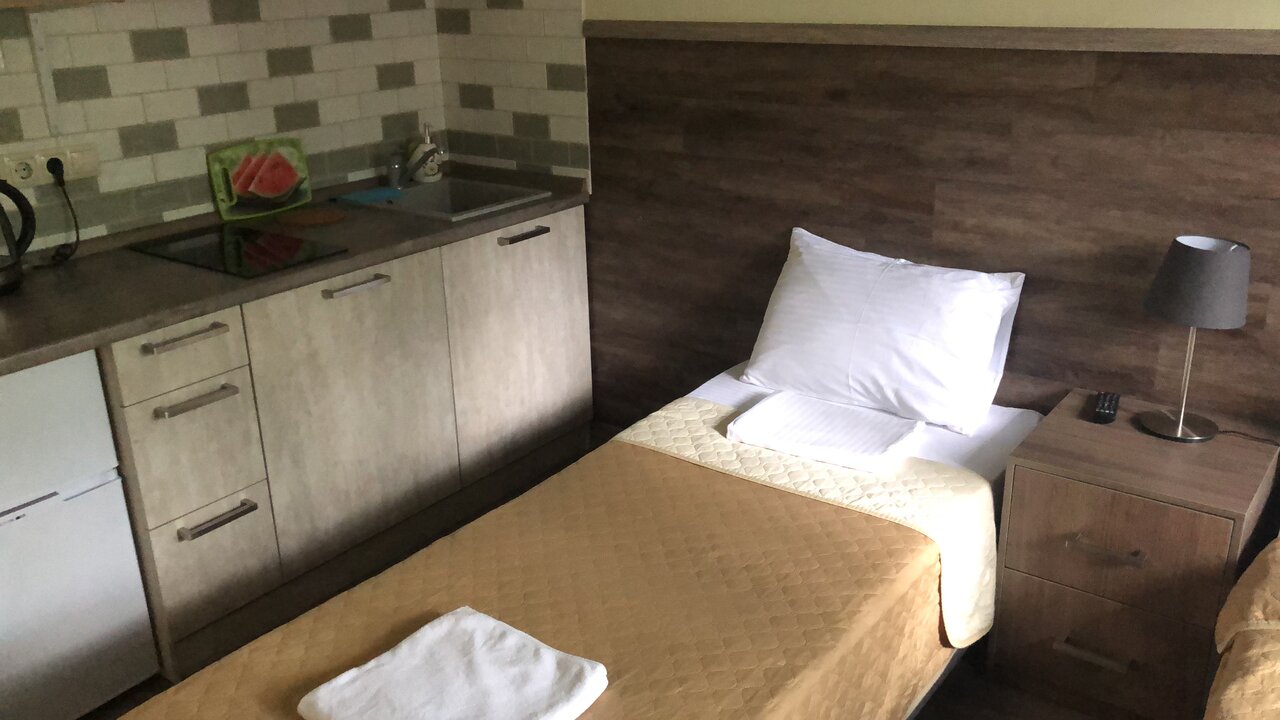 Номер полностью соответствует описанию и фото, все есть(кондиционер , плита, холодильник, тв, микроволновка, чайник, посуда, стиральная машинка,гель , душ, мыло…) Чистое бельё. Попросили фен и утюг, дали сразу, пользовались весь период проживания, никто не просил вернуть, как попользуемся. Район застраивается многоэтажками, рядом Метро и Пятёрочка. Метро в 10 мин ходьбы.Из минусов: много мигрантов, но все мирно; в описании заявлен халат, но он за доп плату. И отель призрачно пустой, никогда нет администратора или сотрудников. Так что если есть вопросы, решайте сразу при заселении, потом никого не найдёте