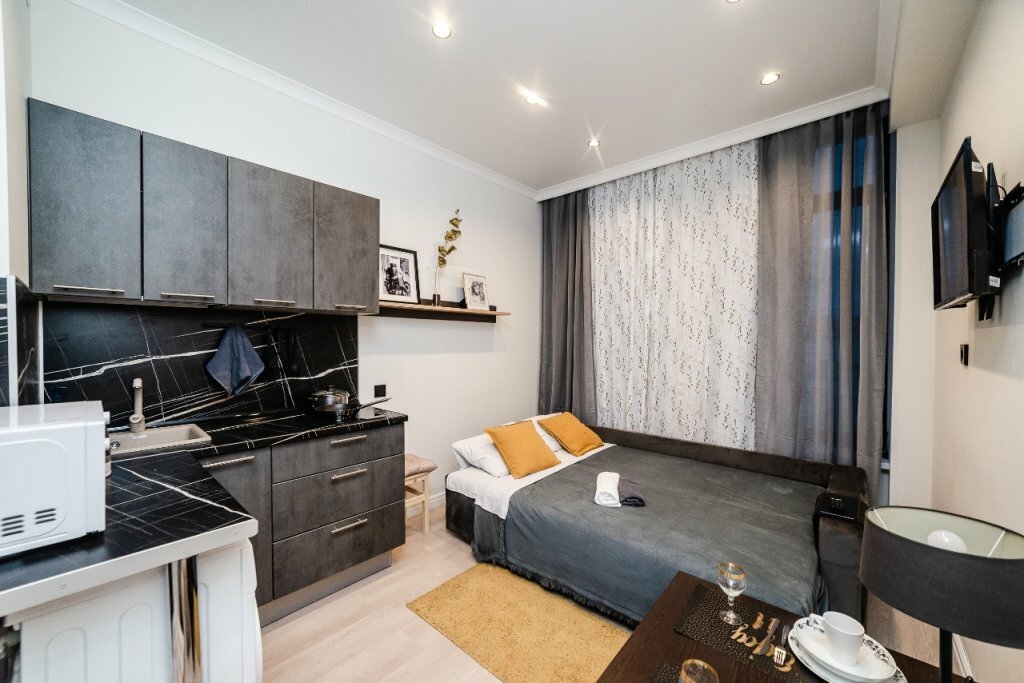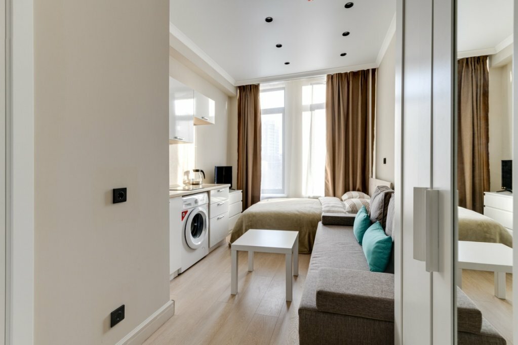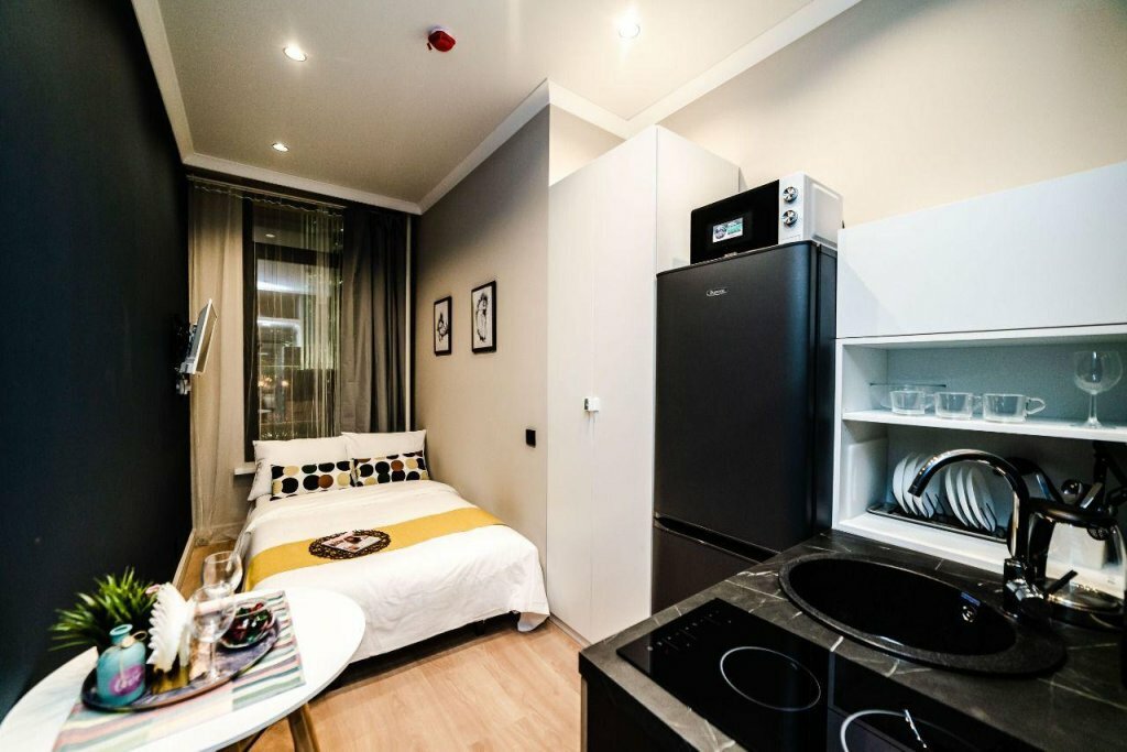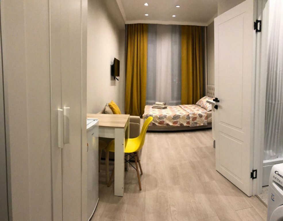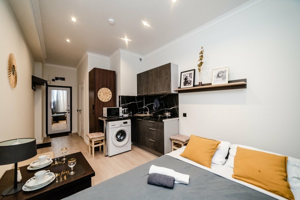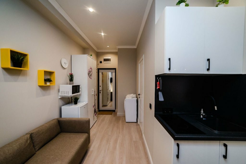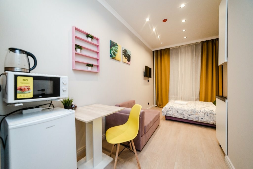 Удобно, что рядом с метро. Квартира с кодовой дверью. Внутри относительно чисто: в душе оказался грибок, полы в квартире не мыты, а в остальном чисто. Из минусов также капающий гигиенический душ, когда открываешь воду в кране раковины. Из плюсов есть почти всё для комфортной жизни: утюг, стиралка, микроволновка, чайник, холодильник. Одеяло в номере для двоих почему-то одно и тонковато, зимой точно замерзнете