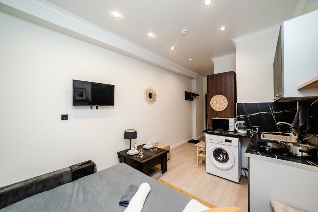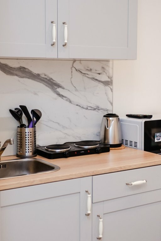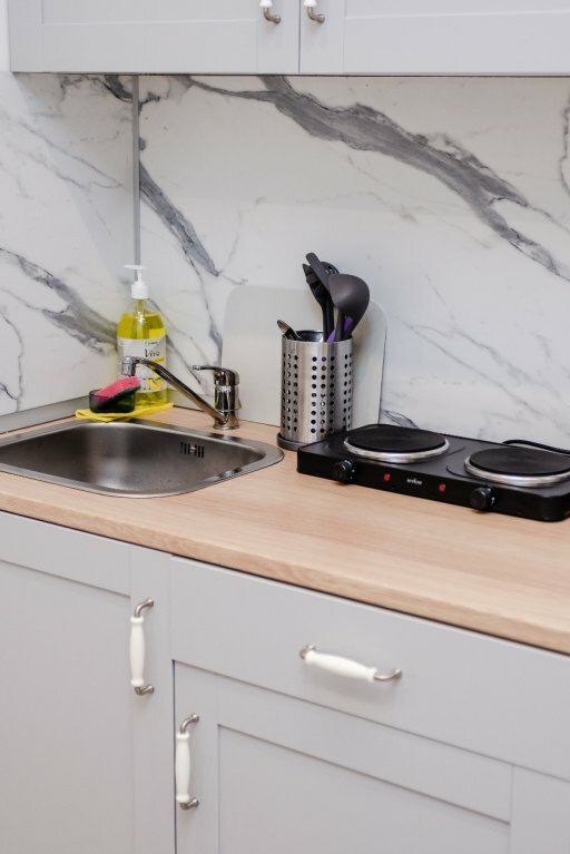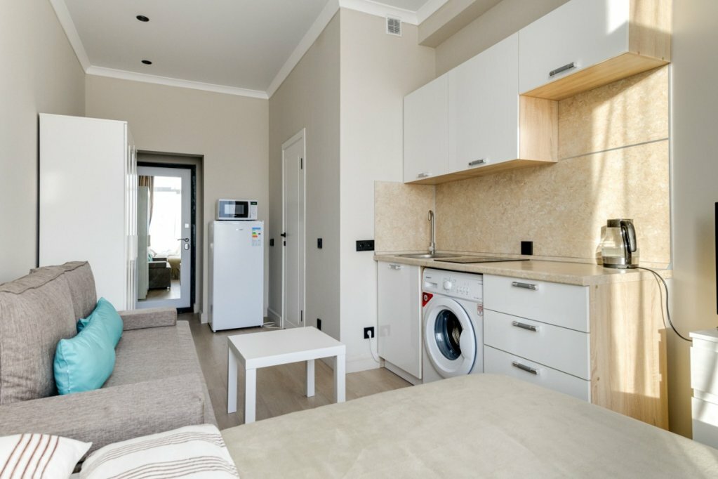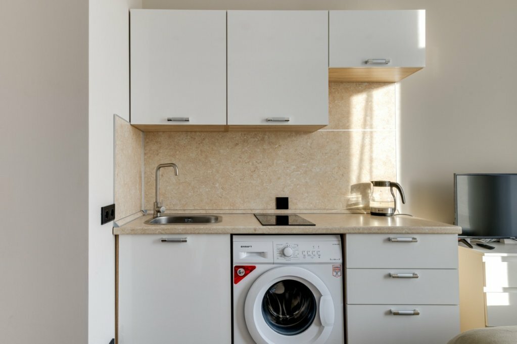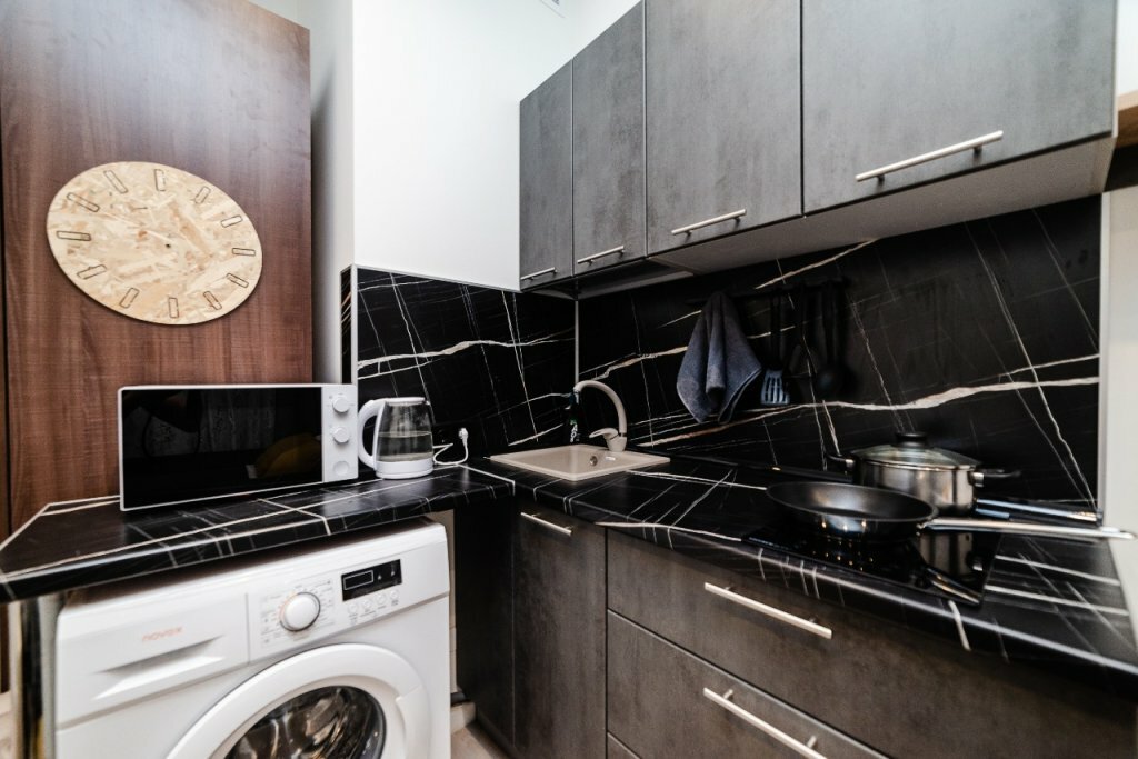 - Есть всё для комфортной жизни:утюг, стиралка, микроволновка, чайник, холодильник.
