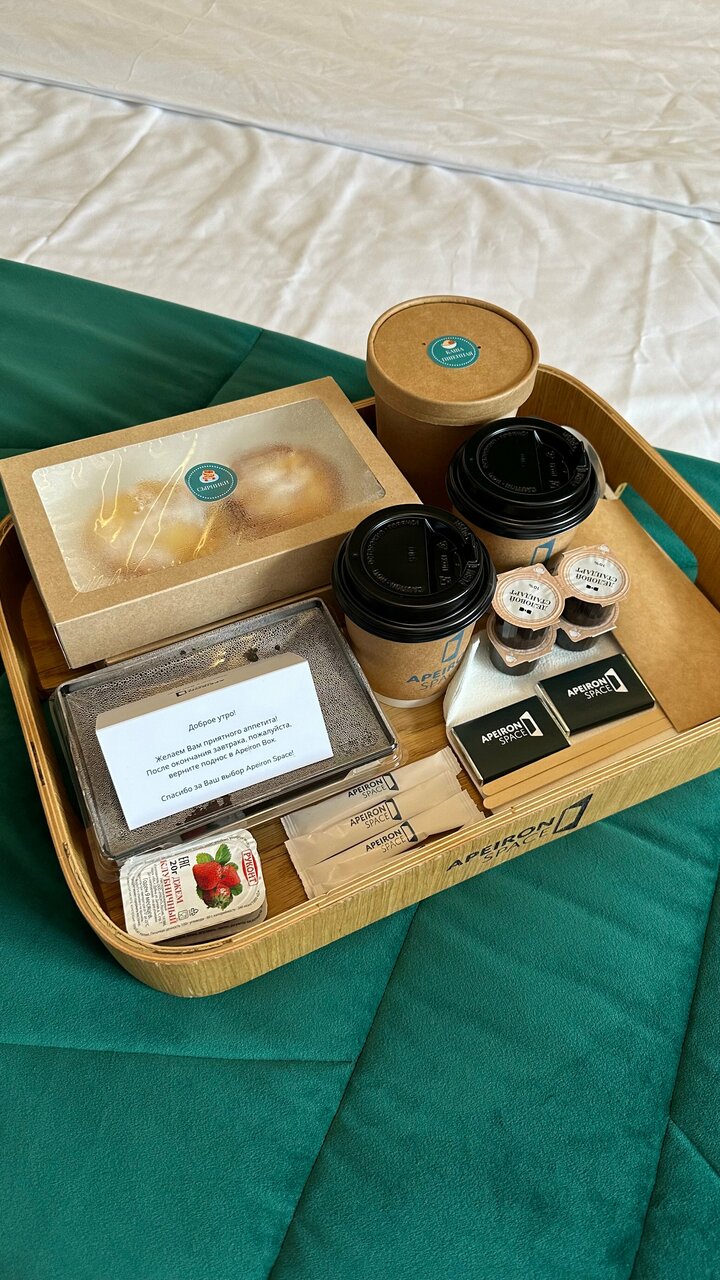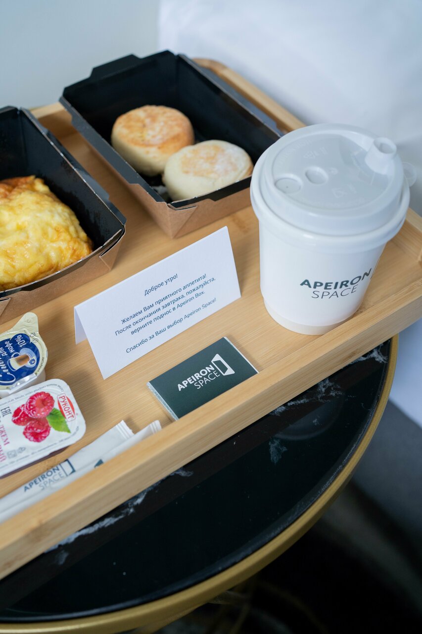 Сырники или каша? Кофе или чай? Выберите свой вариант завтрака прямо в приложении, укажите время доставки, и в назначенный час заказ будет ждать вас в Apeiron Box внутри вашего номера. Не нужно выбегать из душа, чтобы открывать дверь — закончите свои