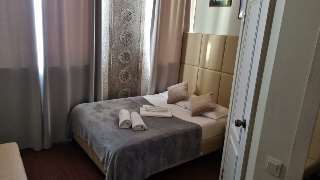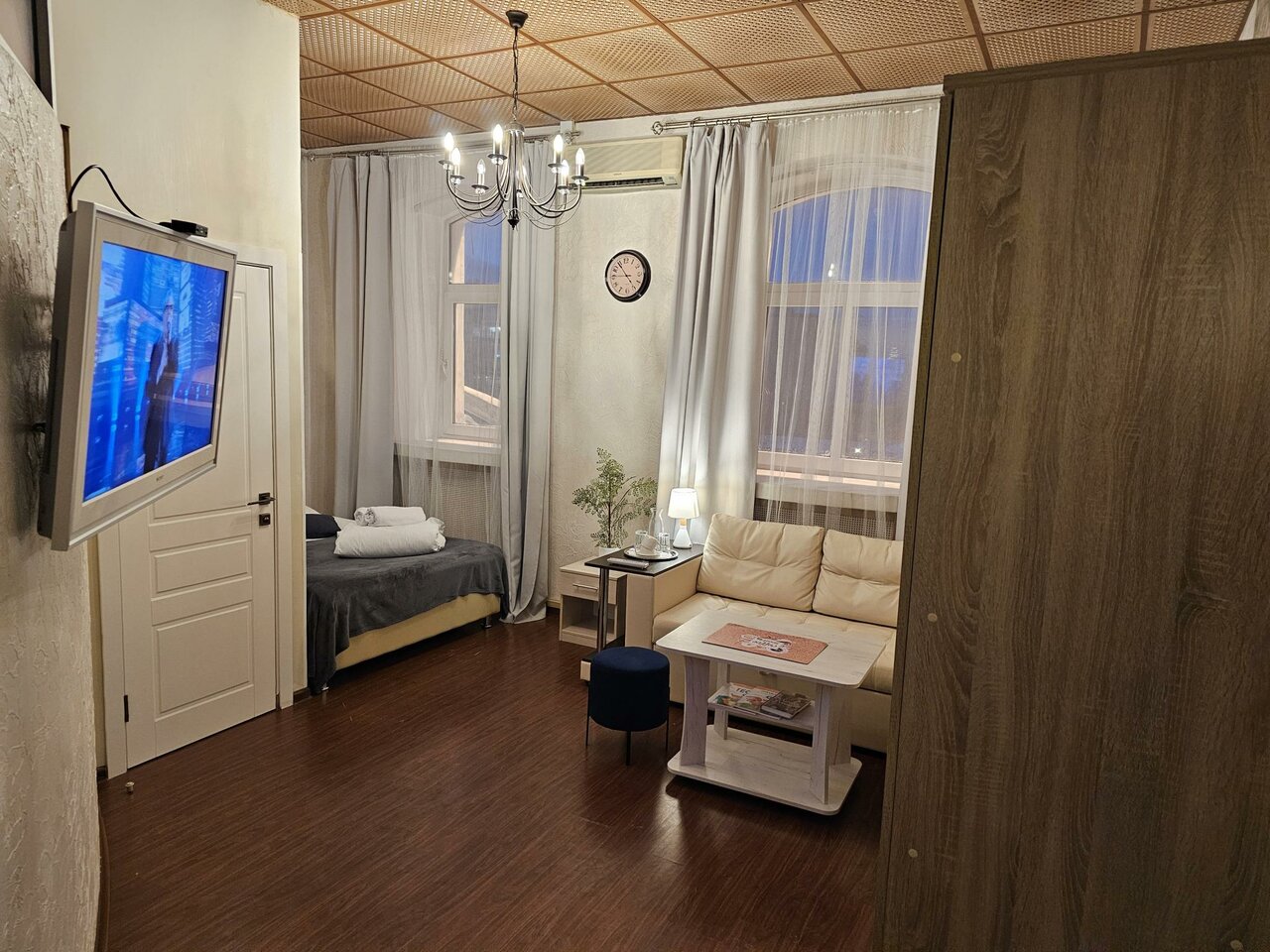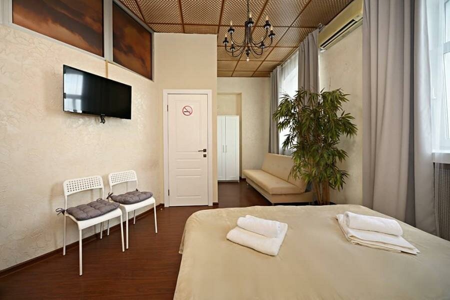 Уютный и супер-комфортный номер вместительностью до-4х взрослых с окнами на Пушкинский сквер и всеми удобствами - душ, туалет, кондиционер, телевизор, холодильник, утюг.