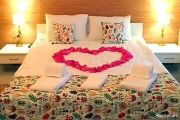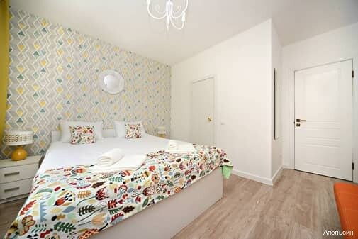 прихожая, кухня-гостиная, спальная комната (одна двуспальная кровать, 1800*2000 мм, шкаф для одежды, 2 прикроватные тумбы, туалетный столик, ТВ)Гостиные оборудованы полноценной кухней (варочная панель, микроволновая печь, холодильник, посудомоечная