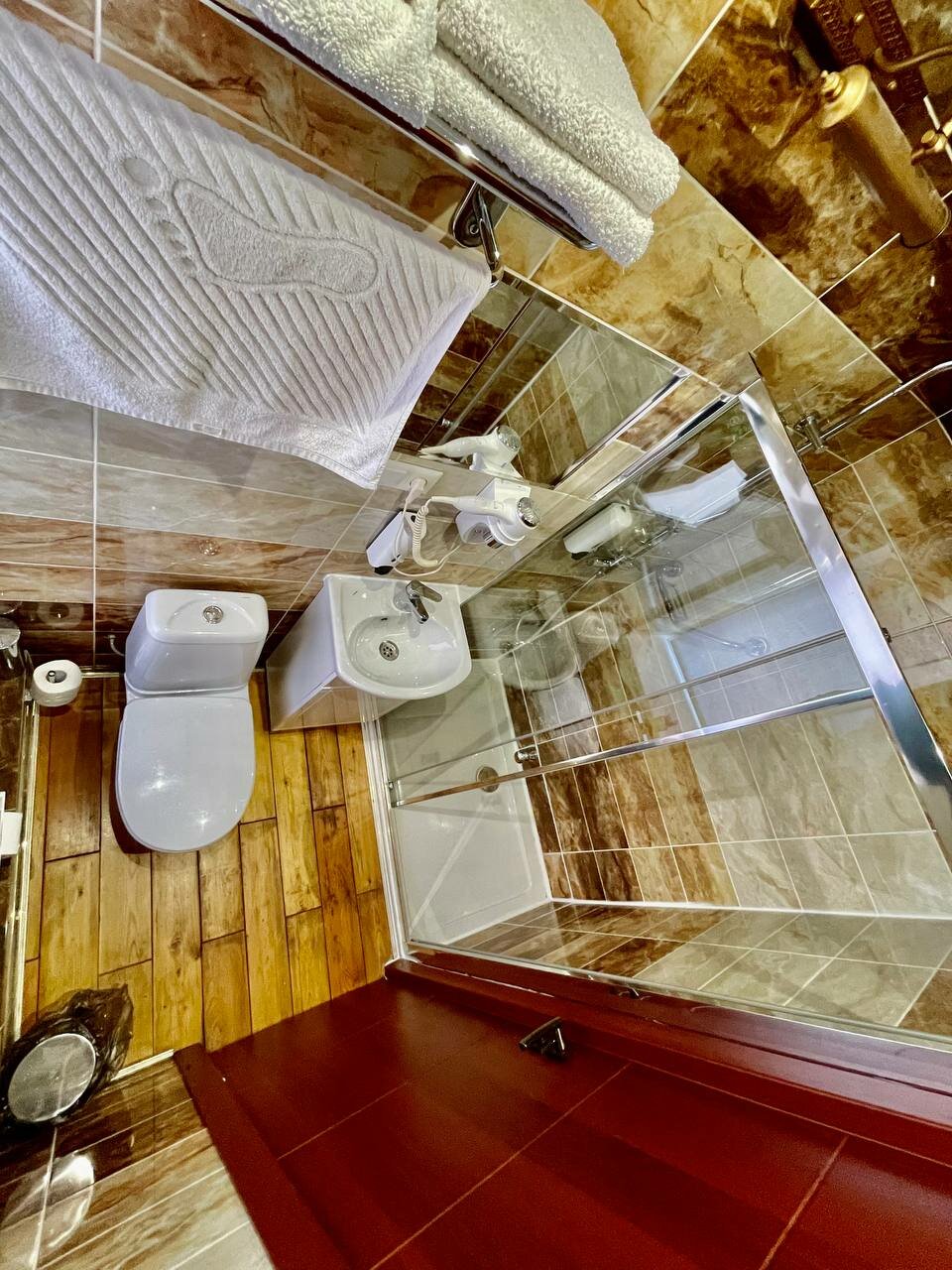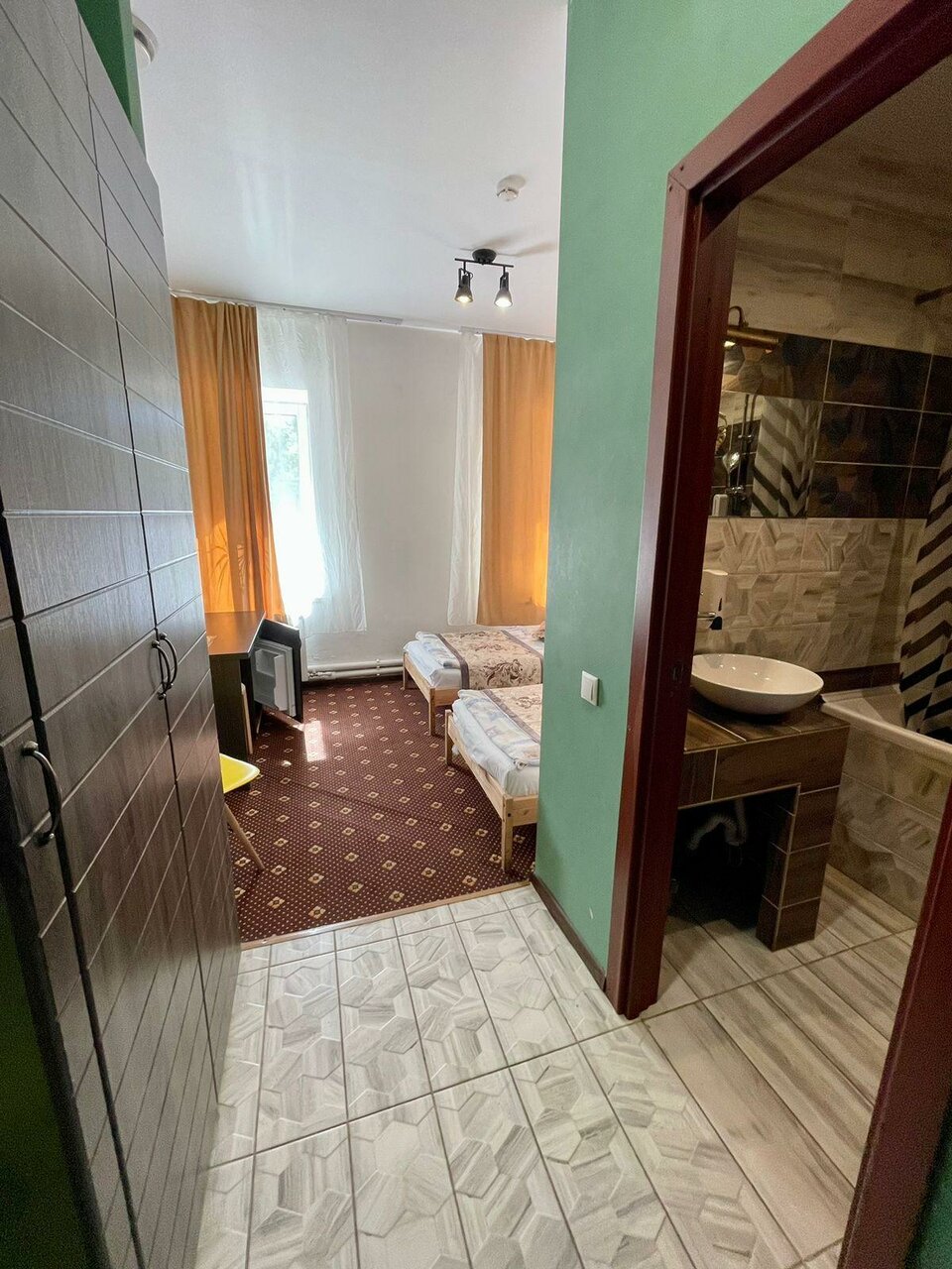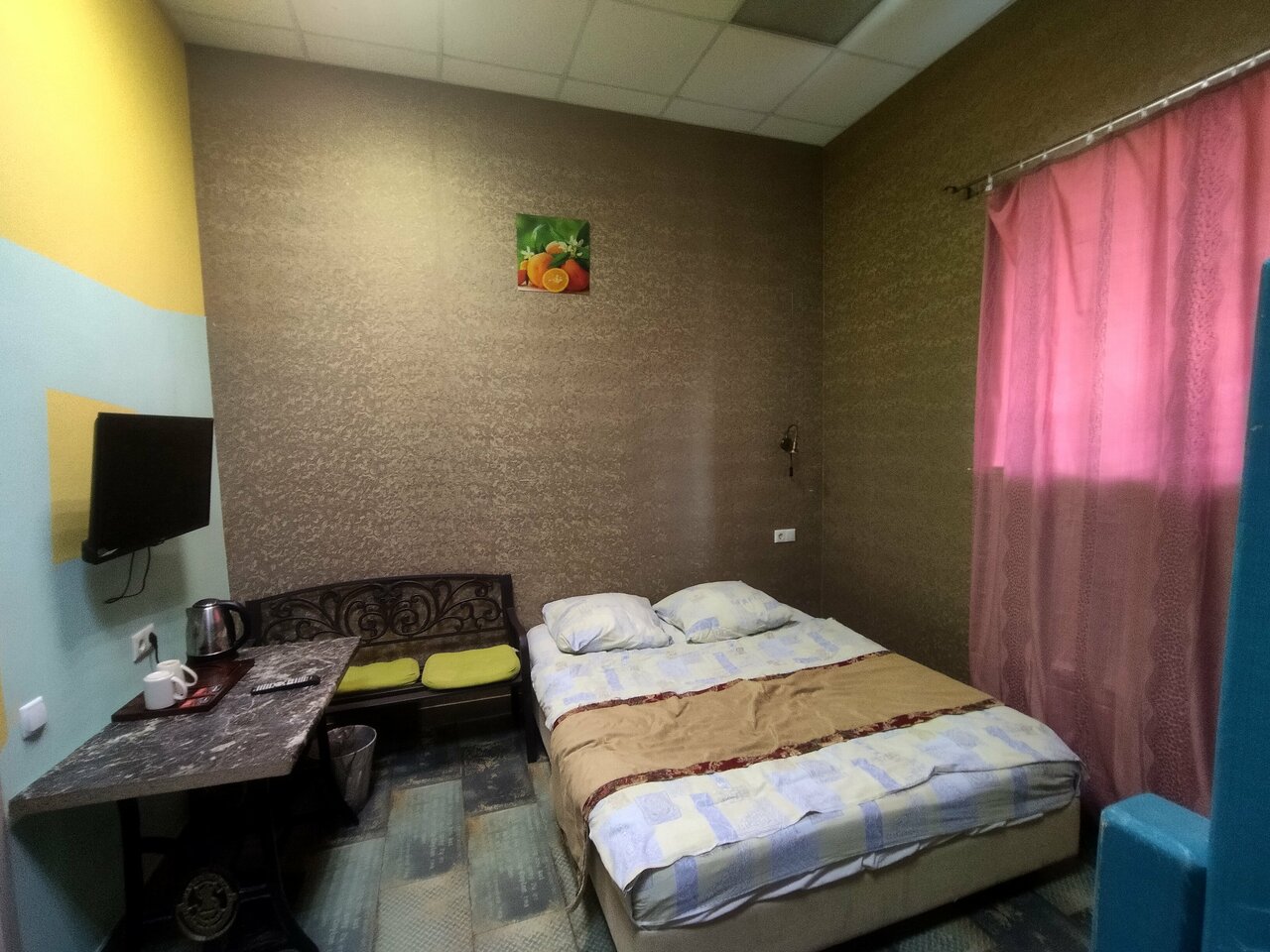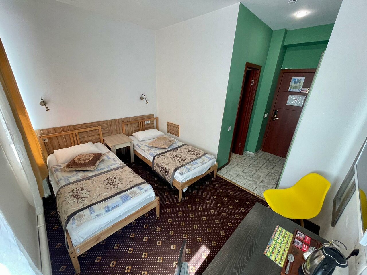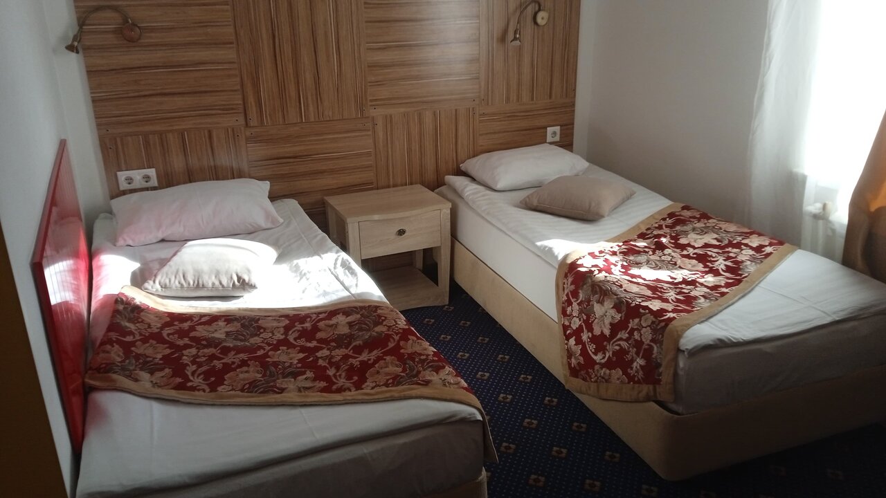 Номер эконом не оправдал наши ожидания (см. первые 3 фото), очень отличался от фото. Попросили нас переселить за доплату в улучшенный (последнее фото), с собственной ванной комнатой, там оказалось все в порядке: чисто, всё необходимое есть, чайник кружки, полотенца, тапочки, постельное белье очень приятно пахло, чистая душевая кабина, гигиенический набор на двоих, всё нормально, но у отеля я так понимаю в целом довольно специфический вкус, интерьер оцените сами по фото, я так и не поняла их стиль К сервису и администратору вопросов нет, приятные доброжелательные люди В целом я бы в следующий раз больших ожиданий не строила, выбирали отель за день до поездки из того, что осталось