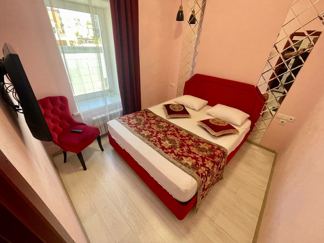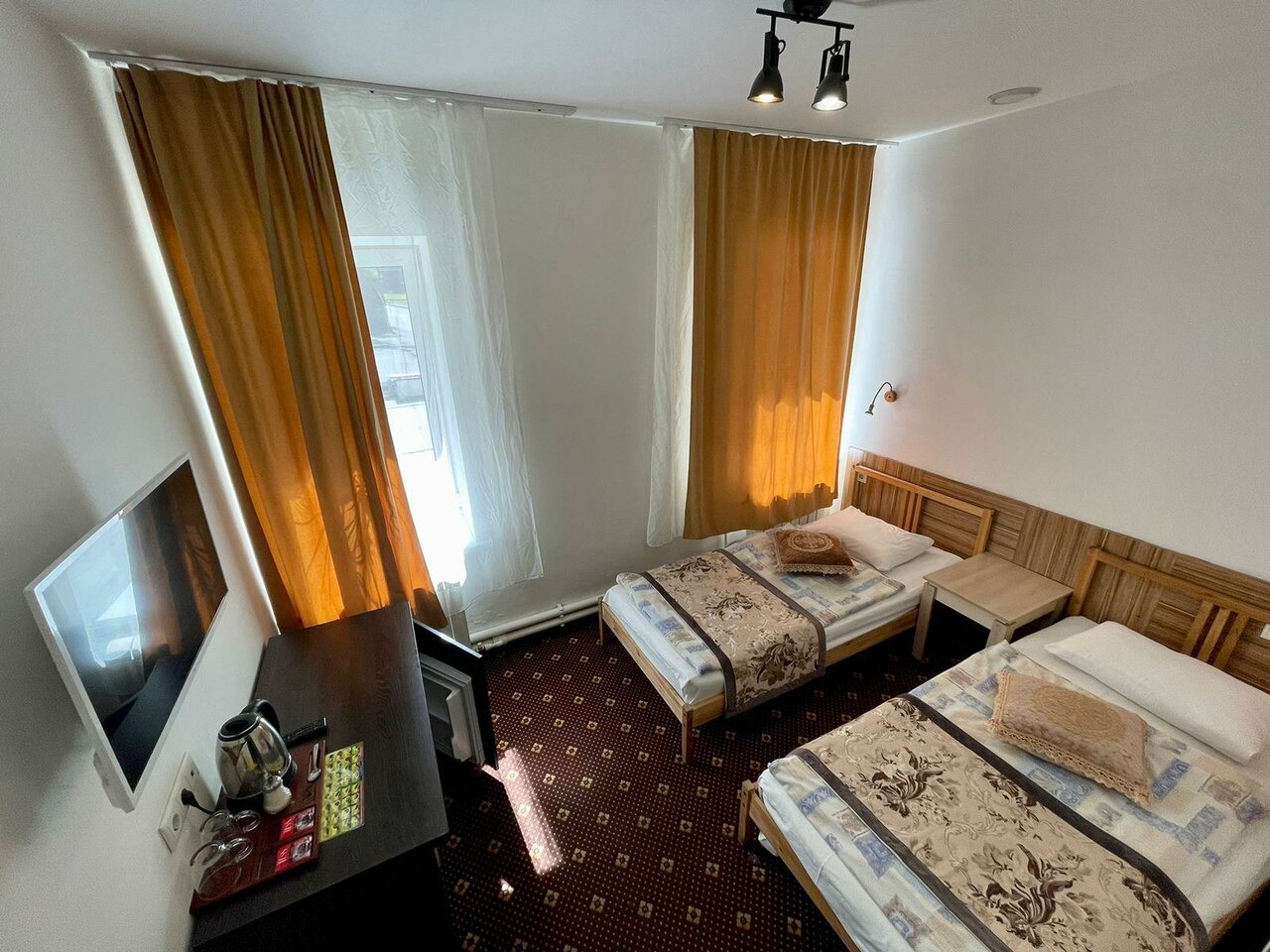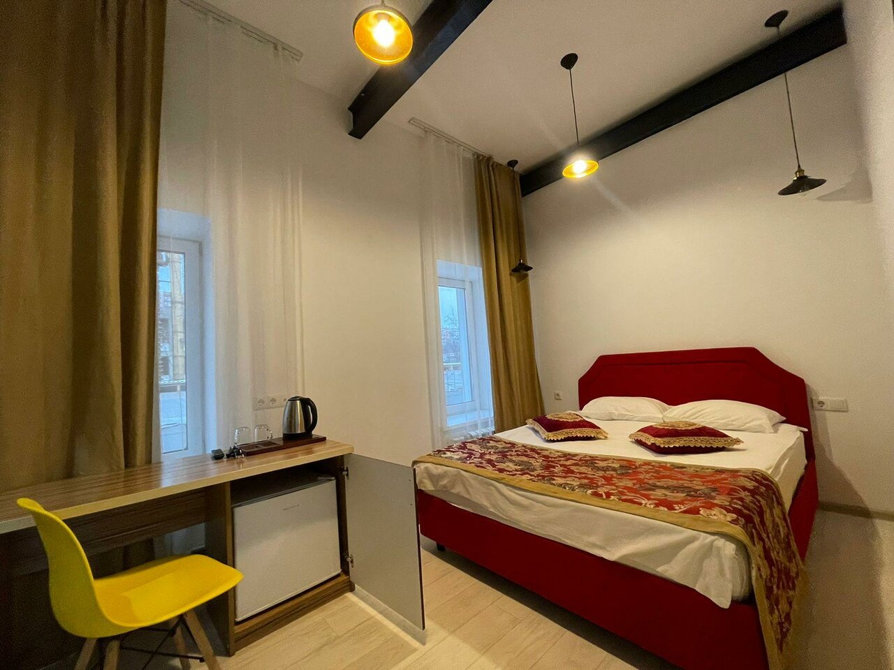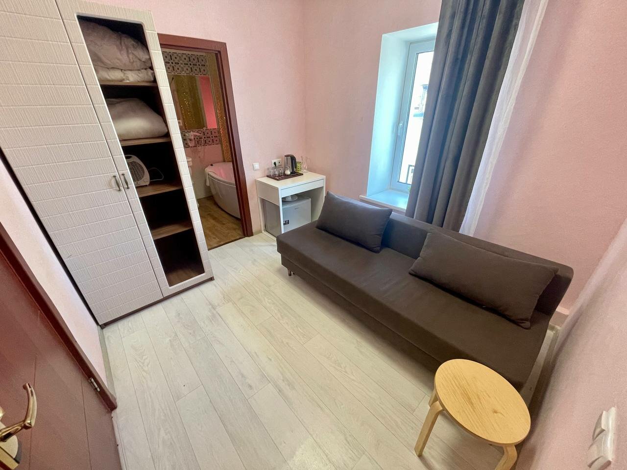 Номер эконом не оправдал наши ожидания (см. первые 3 фото), очень отличался от фото. Попросили нас переселить за доплату в улучшенный (последнее фото), с собственной ванной комнатой, там оказалось все в порядке: чисто, всё необходимое есть, чайник кружки, полотенца, тапочки, постельное белье очень приятно пахло, чистая душевая кабина, гигиенический набор на двоих, всё нормально, но у отеля я так понимаю в целом довольно специфический вкус, интерьер оцените сами по фото, я так и не поняла их стиль К сервису и администратору вопросов нет, приятные доброжелательные люди В целом я бы в следующий раз больших ожиданий не строила, выбирали отель за день до поездки из того, что осталось