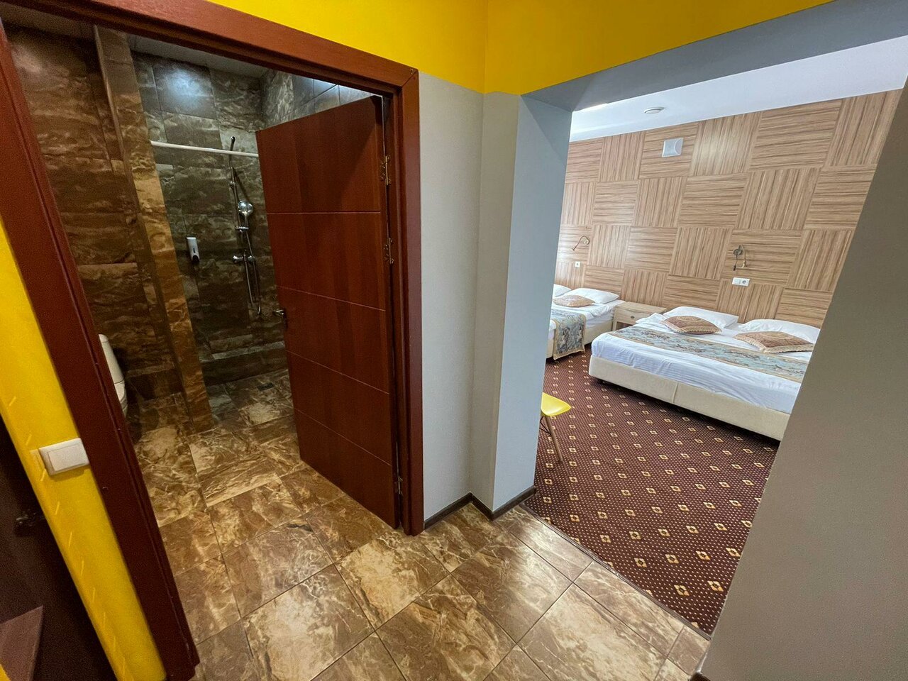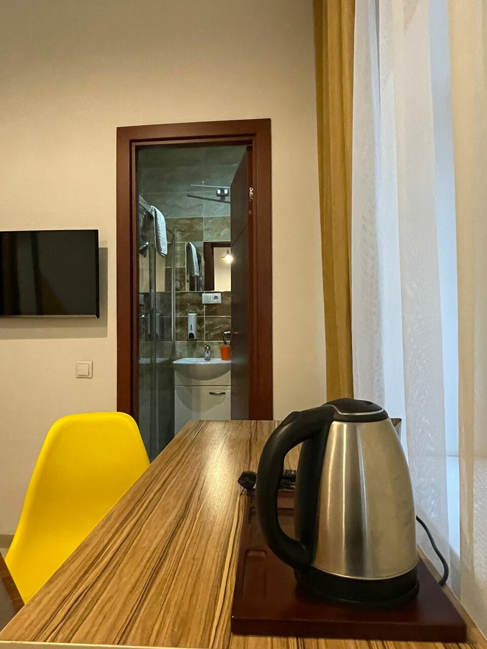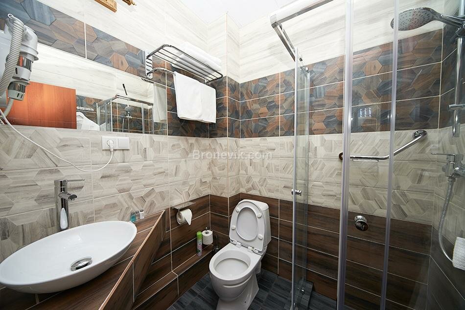 Ну очень маленький номер стандарт, дверь в ванную нужно открыть- закрыть и только потом окажешься в ванной, розеток 1 шт., Чайника нет в номере, цена 2500 сутки, слышимость отличная в особенности когда соседи занимаются сексом. Вода горячая закончилась через 5мин. В номере холодно.