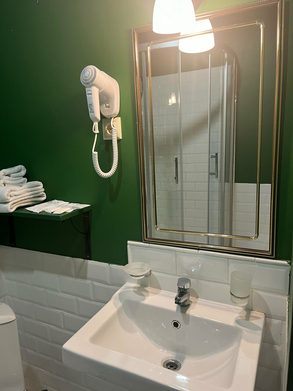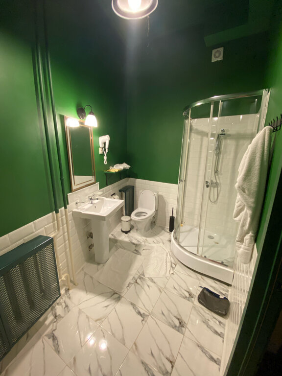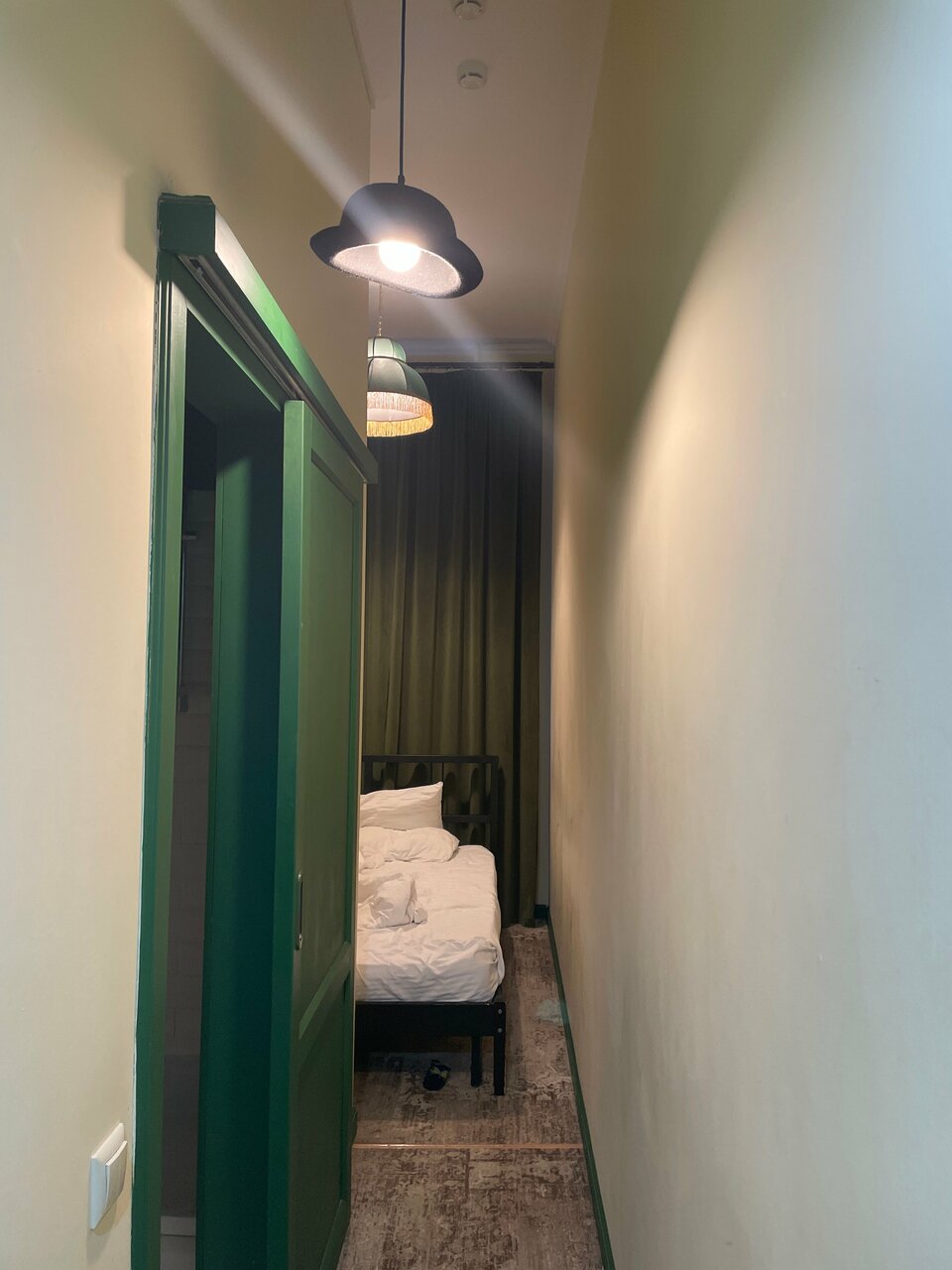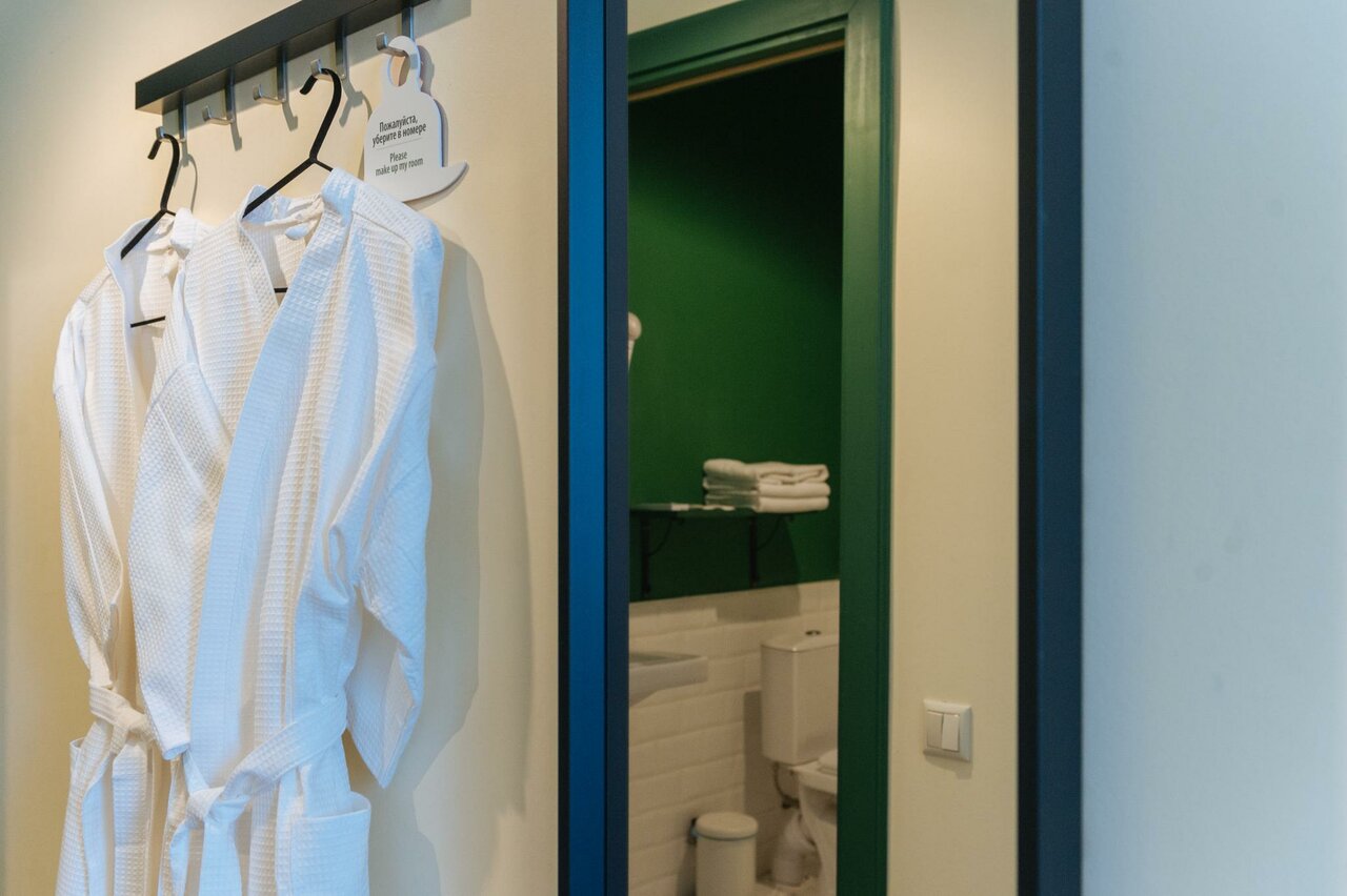 Чисто, уютно, есть полотенца и халаты. Интересный интерьер) Из минусов — окна были во двор и там периодически кидали мусор в баки))