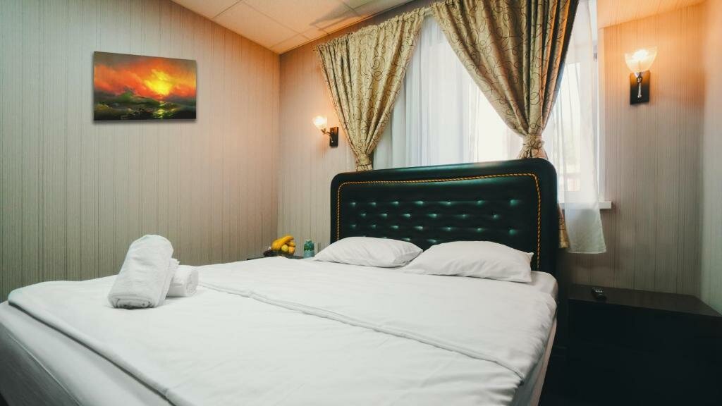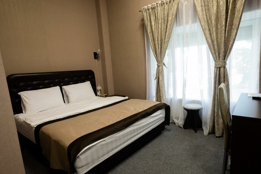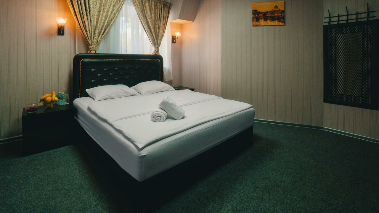 Номер с двуспальной кроватью. Оборудованный чайником, холодильником, телевизором, телефоном, необходимой посудой. Раздельный санузел предоставляется на две комнаты. Фен Вы всегда можете взять на стойке ресепшн.