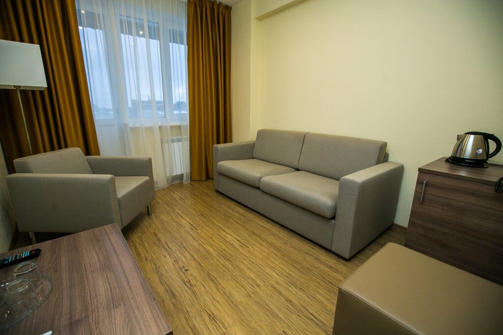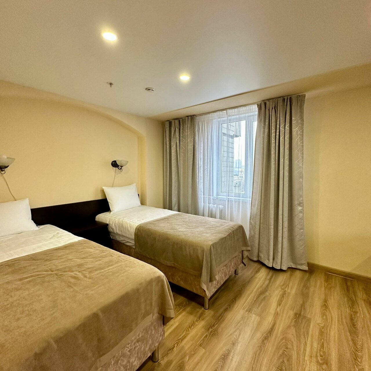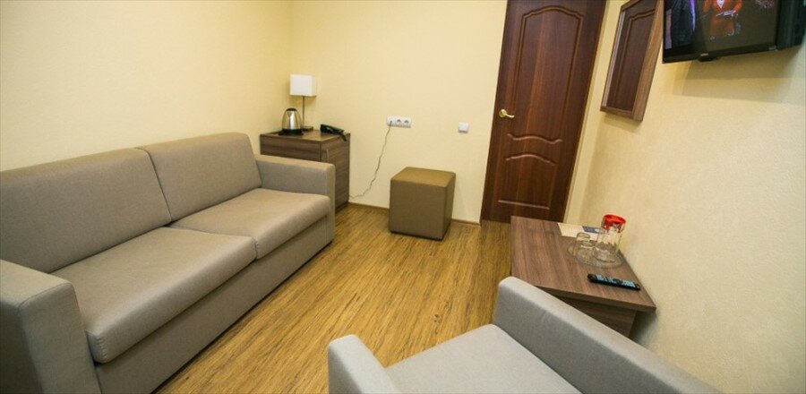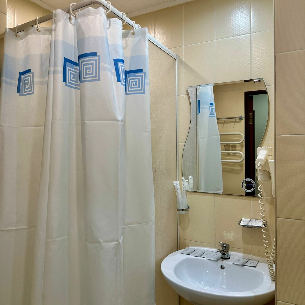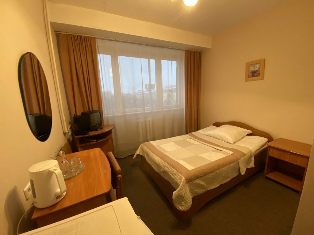 Жили в трёхместном номере. Надо было просто переночевать. Для таких случаев нормальный вариант. Номера чистые, интерьер не новый мягко говоря, в ванной мыло, гель, шампунь. Огорчило отсутствие персонала в кафе утром, хотя было открыто. До метро станция Спортивная метров 200 наверное, что тоже очень удобно. Номер на сутки на 3 человека обошёлся в 4200 руб.