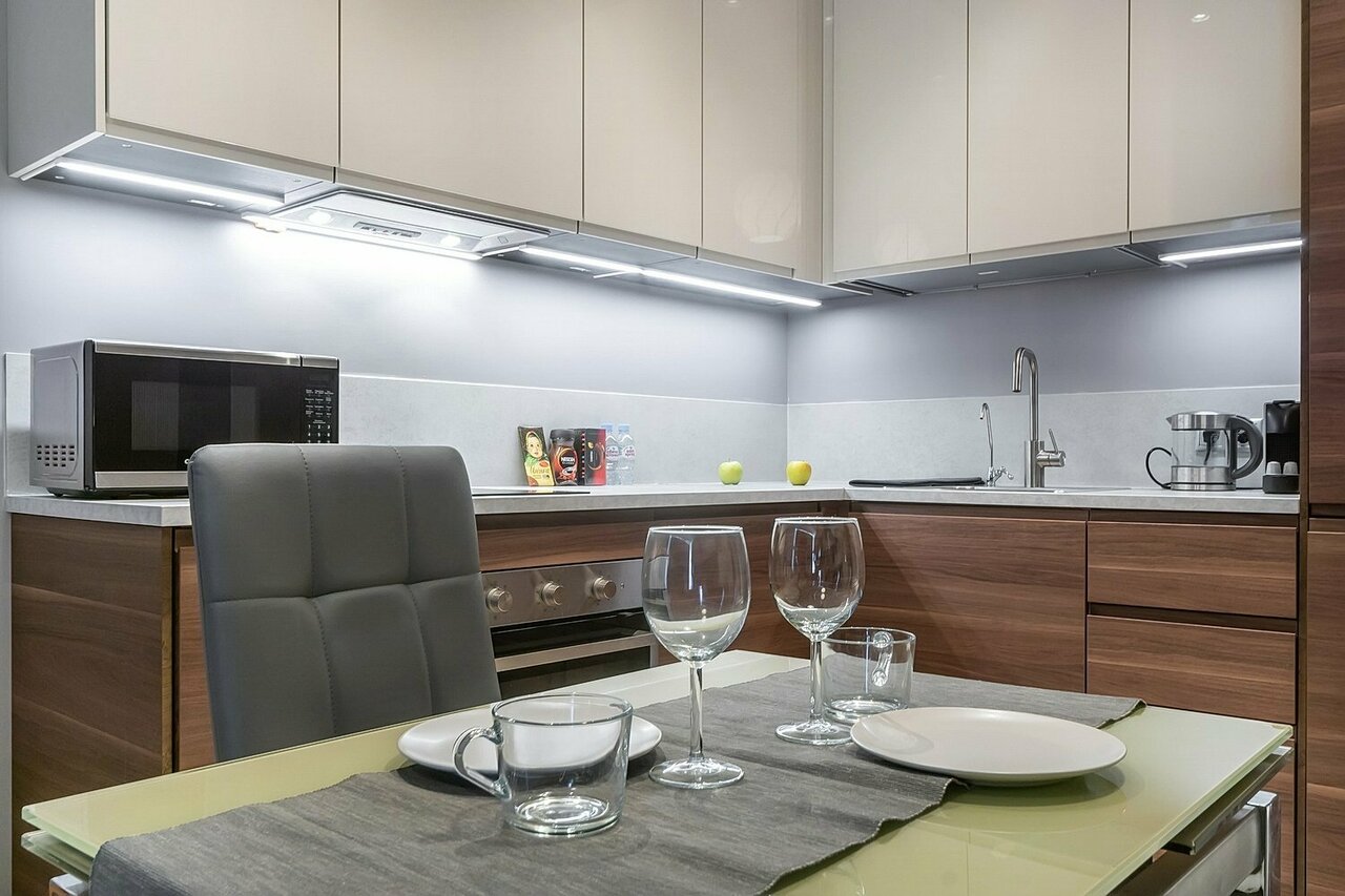 - Красивый кухонный гарнитур и наличие посуды.