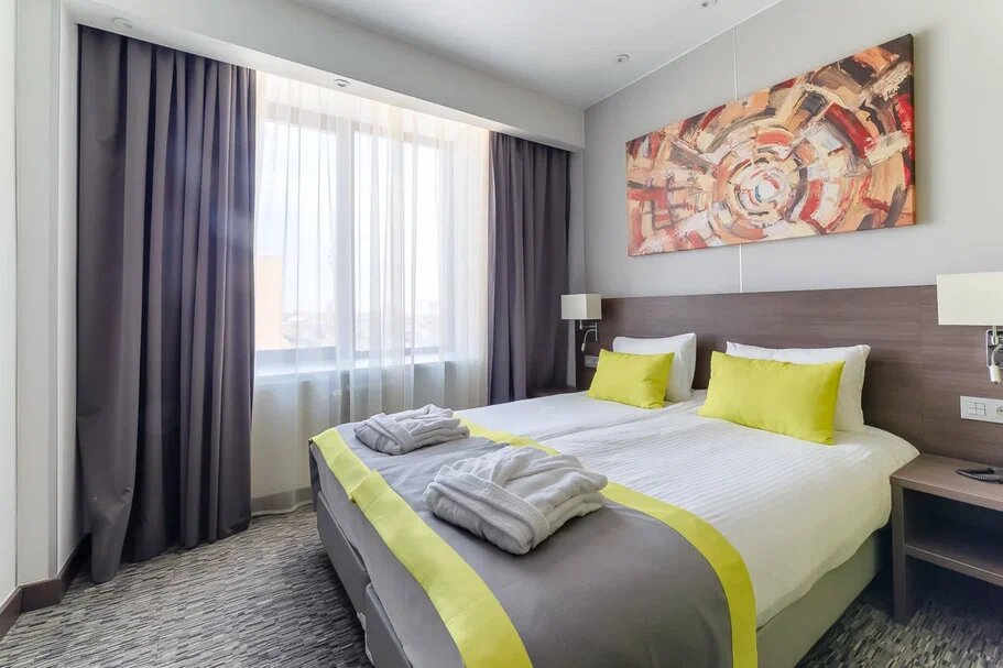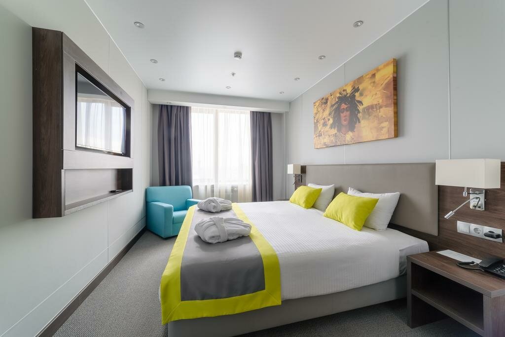 Шикарный отель! Стиль — отпад))) интересные картины, скульптуры! Номер хороший, чистый, людей много, но на этаже совсем не встречаешь))) 4 звёзды! Рядом магазин Перекрёсток можно выйти на первом этаже через отель! Цены отличные на завтраки, меню хорошее! Процветания Вам!!!!