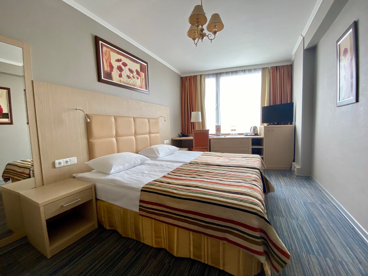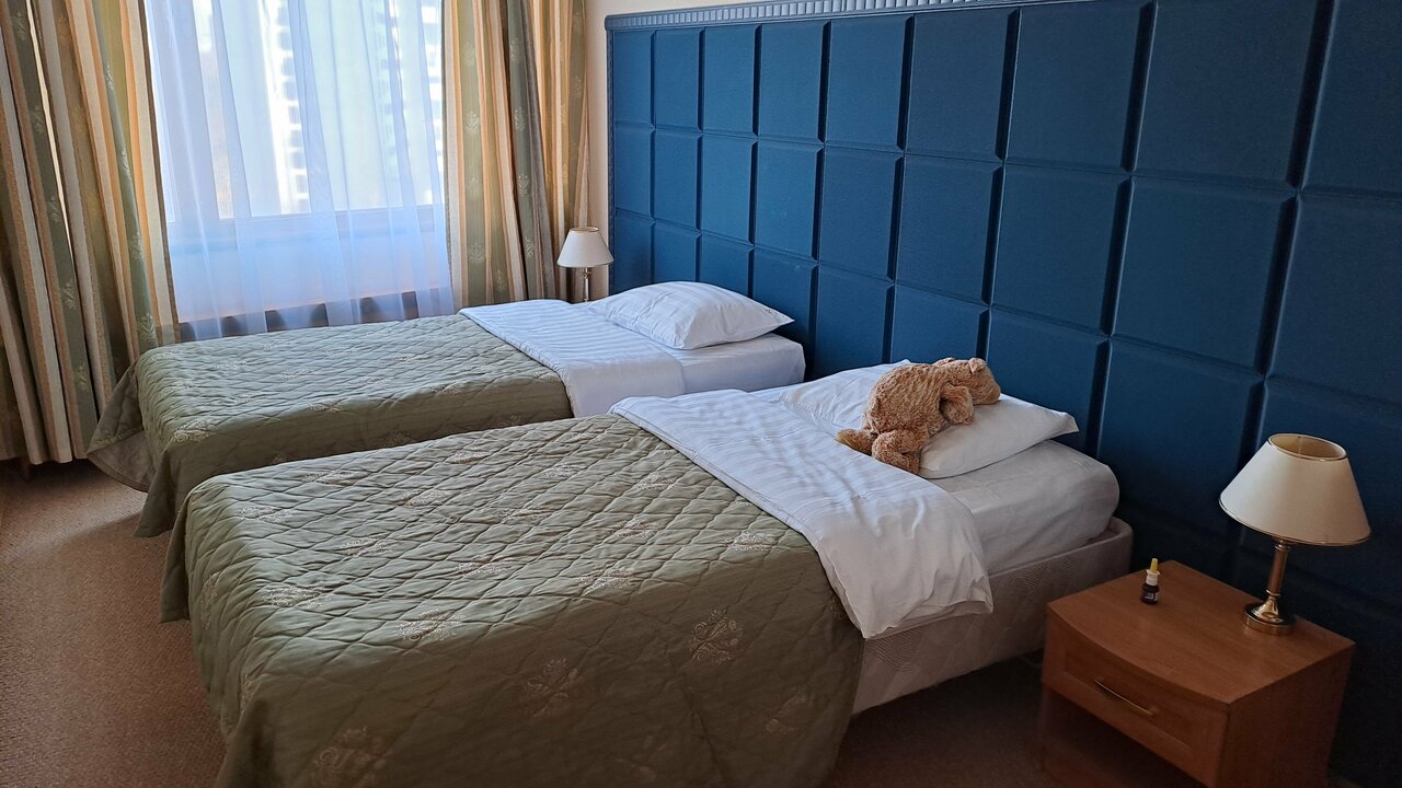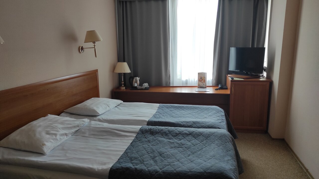 Возможно нам не повезло и есть номера лучше, но в нашем были пятна на паласе и обоях. На стене видели таракана( Весь этаж выглядел так, будто больше 20 лет не делали ремонт и месяцами не убирали. Этаж, на который ходили в гладильную комнату, был ещё хуже. Ковровое покрытие дыбом. Просили поменять номер, тк были с маленьким ребёнком — отказ. Ещё в гостинице уверяли, что у них не курят, но нам в приоткрытую щель Окна прилетела куча пепла, весь стол, посуда, чайник, детские каши и т.д.были им покрыты.