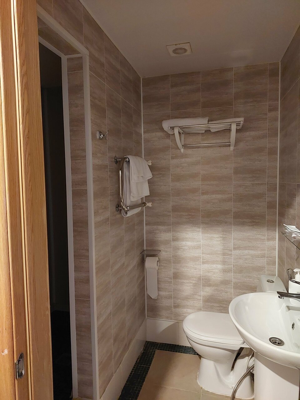Бесплатный трансфер до отеля из аэропорта, предложили также трансфер обратно, но он не понадобился. В 12 минутах ходьбы от ближайшей остановки автобусов по пересечённой местности (деревянный мостик, деревянная дорожка и асфальт). Завтрак нормас, советую тот, который с блинчиками — самый сытный. Вайфай ловил хорошо, но тот, который 2 ГГц, на 5 ГГц почему-то сигнал слабый был, но и двушки хватало за глаза. Номера не очень большие, душ с поддоном и без дверей, только зановесочка. Комплект гель для душа + шампунь положили, но мы ими не пользовались. Вытяжка в ванной комнате крайне шумная, поэтому я пользовалась комнатой с фонариком :’D Матрасы мягкие, с непривычки утонула в них, но уснула нормально. Кулер на этаже. В целом ставлю 5 звёзд за бесплатный трансфер в час ночи и ночёвку без проблем, о большем я и не просила 🙂