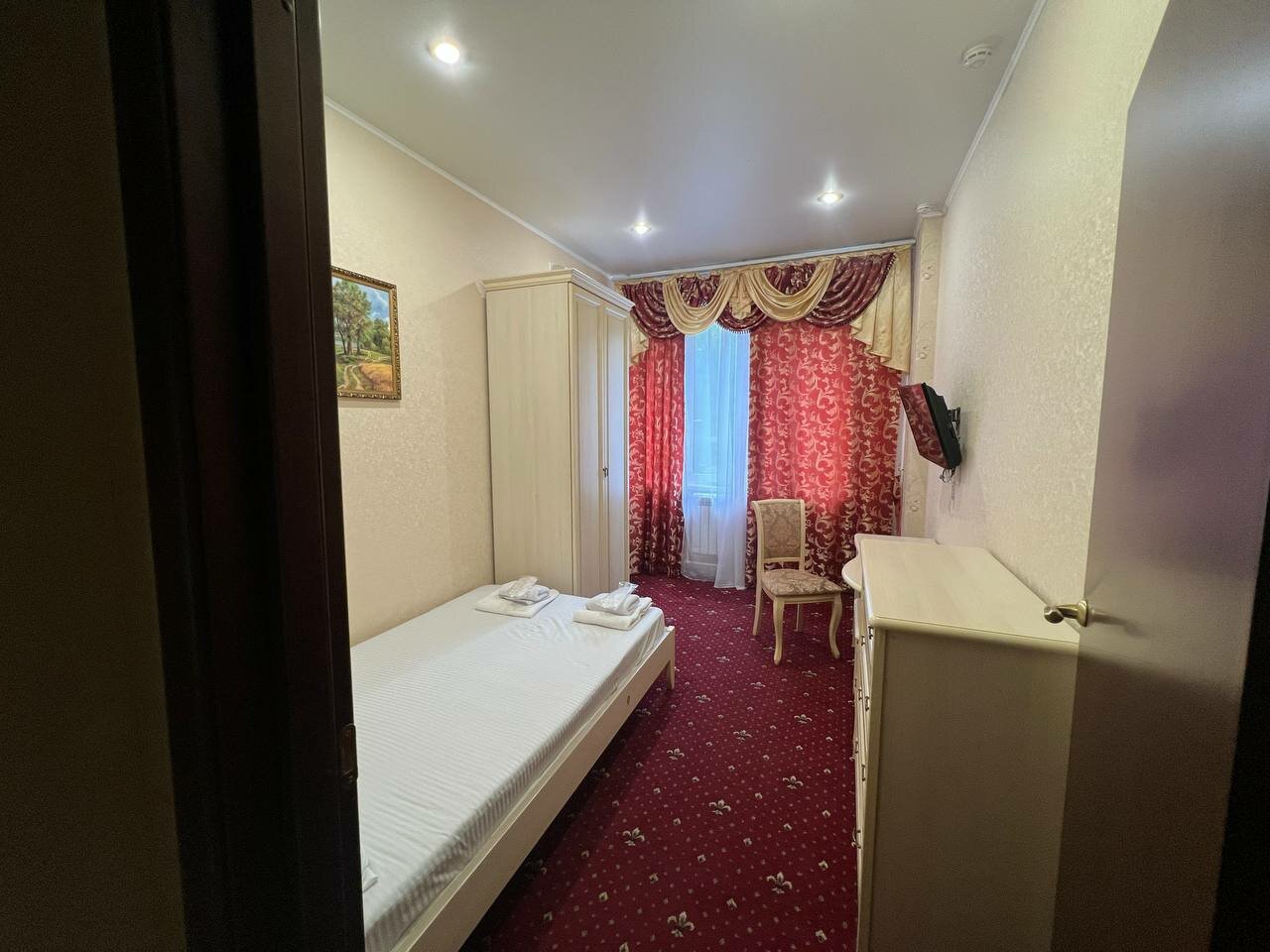 Уютный номер комфорт с собственным санузлом.В номере: Односпальная кровать, комод,стол с тумбой, шкаф для одежды, санузел с душевой кабиной, телевизор, косметика для душа, полотенца, тапочки,кондиционер, WI-FI.
