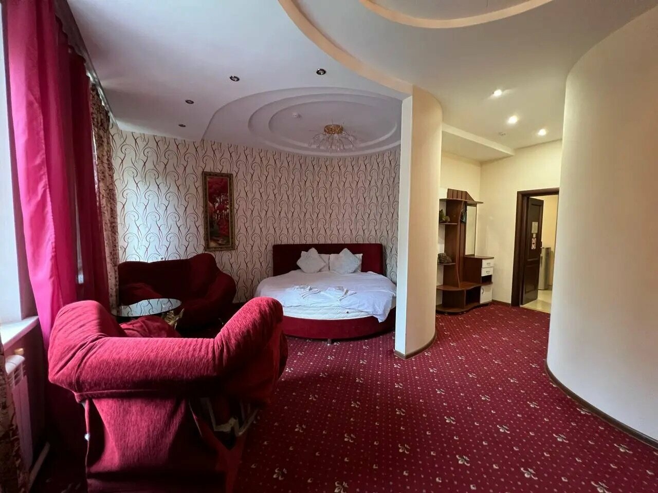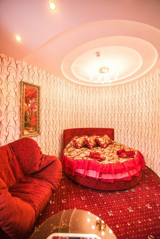 Комфортабельный номер Люкс с удобной мебелью и собственным санузлом.В номере: большая круглая двухспальная кровать, два кресла, тумба, журнальный столик, шкаф для одежды, санузел с ванной, телевизор, косметика для душа, полотенца,кондиционер, WI-FI