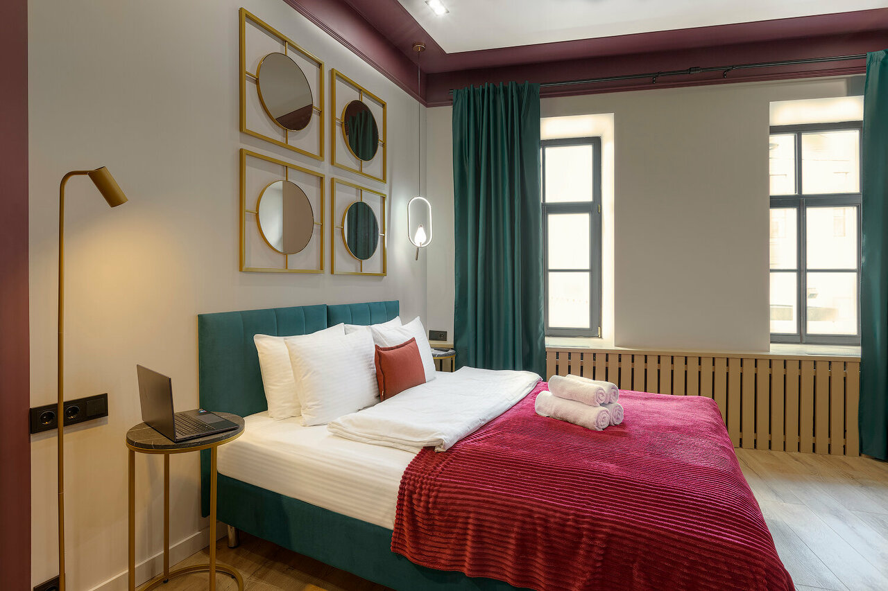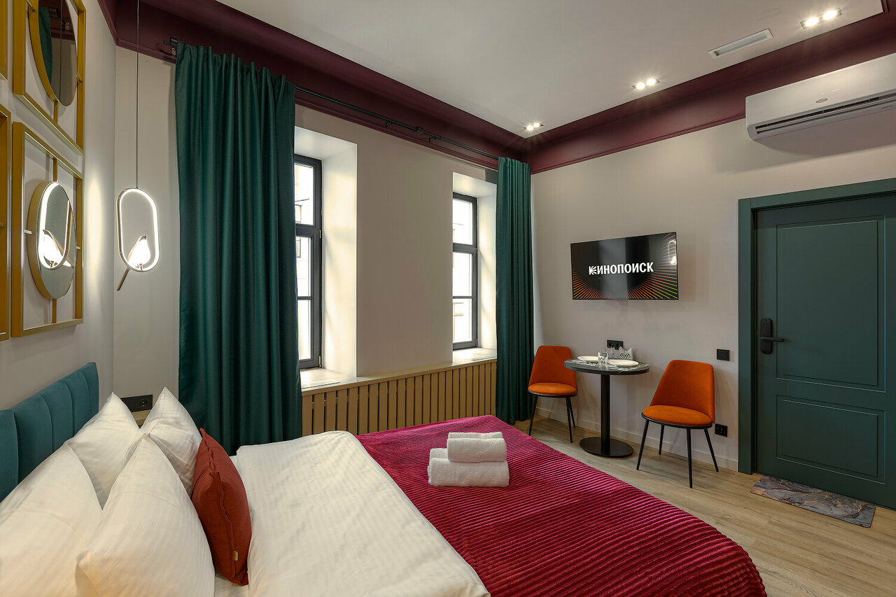 Комфортный номер с интересным дизайнерским решением. В номере есть ванная и кровать king-size (180 см). Площадь номеров в категории от 23 до 25 м².Помимо двуспальной кровати в номере есть раскладное кресло, на котором может разместиться 1 гость....