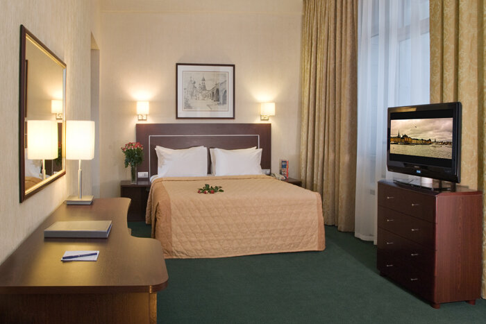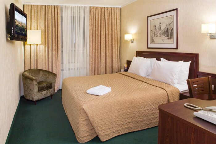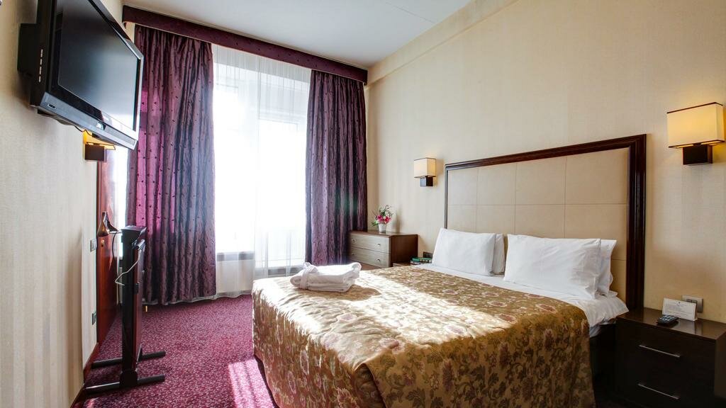 Гостиница неплохая, номера чистые с хорошим свежим ремонтом. Удобная кровать и подушки. Попросила выселиться в 12.30, разрешили. Из минусов: нет халата в номере, только по запросу. Нет утюга, только гладильная комната, это прям очень неудобно. Впервые с таким столкнулась в отелях 4-5 звёзд.