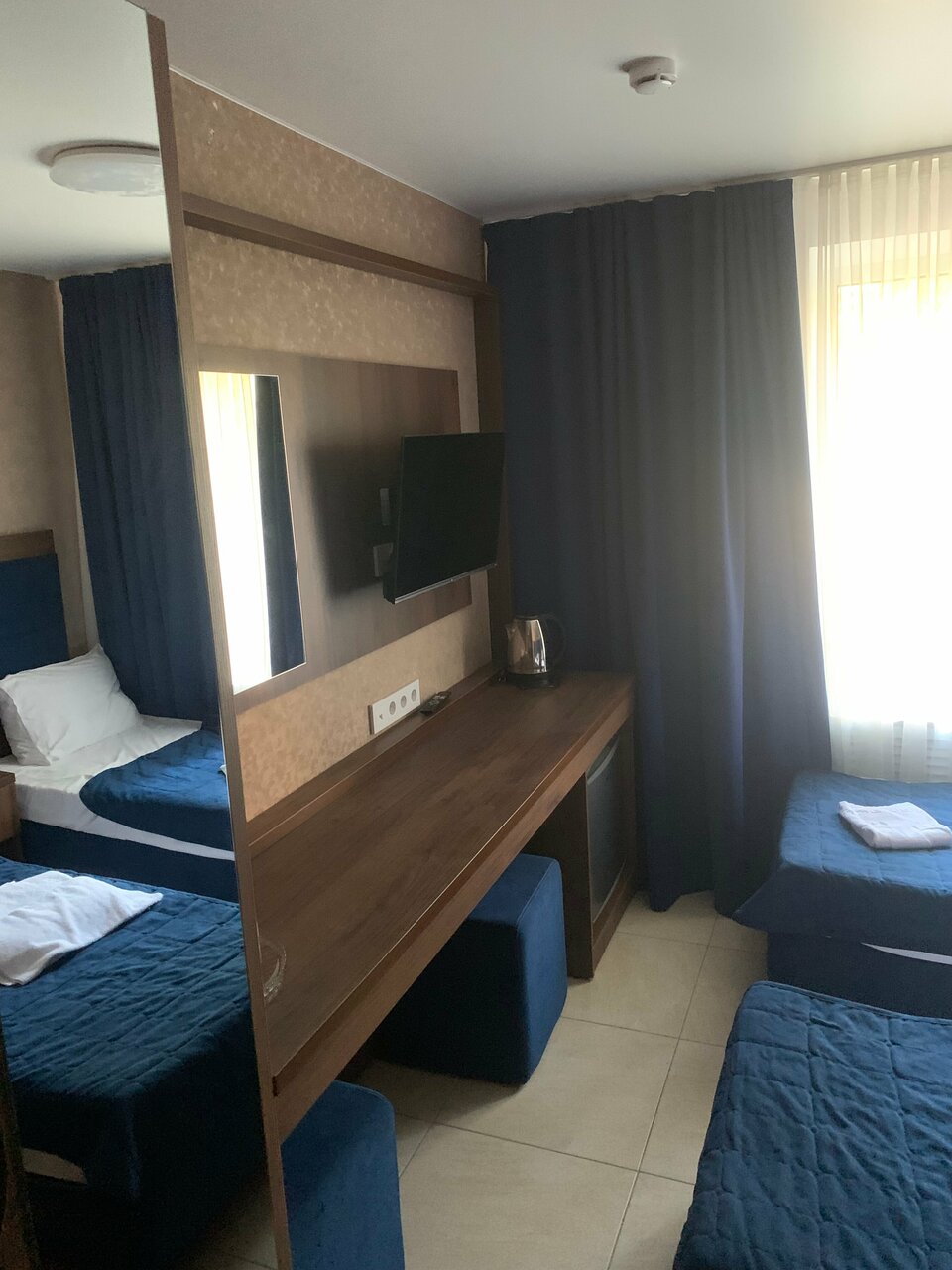 Чудесный отель, отличное расположение. Чистый номер, маленький, но очень аккуратный и уютный! Телек, чайник, куллер в коридоре, опрятный душ и туалет. Всё маленькое, компактное, для 1 человека — идеально, для 2 — отлично! Есть прачечная самообслуживания. Приветливый персонал. Идеальное место для спокойных ночевок во время учебы, рабочих поездок, командировок. Единственный минус — нет вида но море :) Ближе идти от станции метро Ботанический сад Благодарю!!!